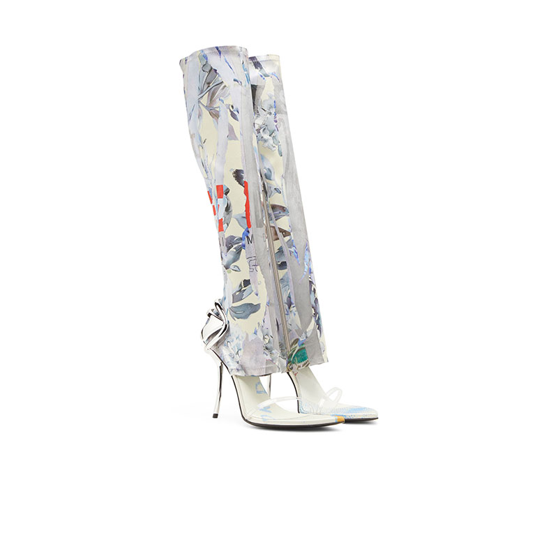 Fusing fashion and music, these women's shoes are part of the Remaster capsule, celebrating music’s transformative power by honoring influential DJs across the globe. The hybrid design, a cross between knee-high boots and strappy sandals, features the hallmarks of Diesel's unmistakable Ten & A Half silhouette – a sleek Oval D wraps the back of the shoe and merges with the elegantly curved heel. The printed graphics are unique to the collection.