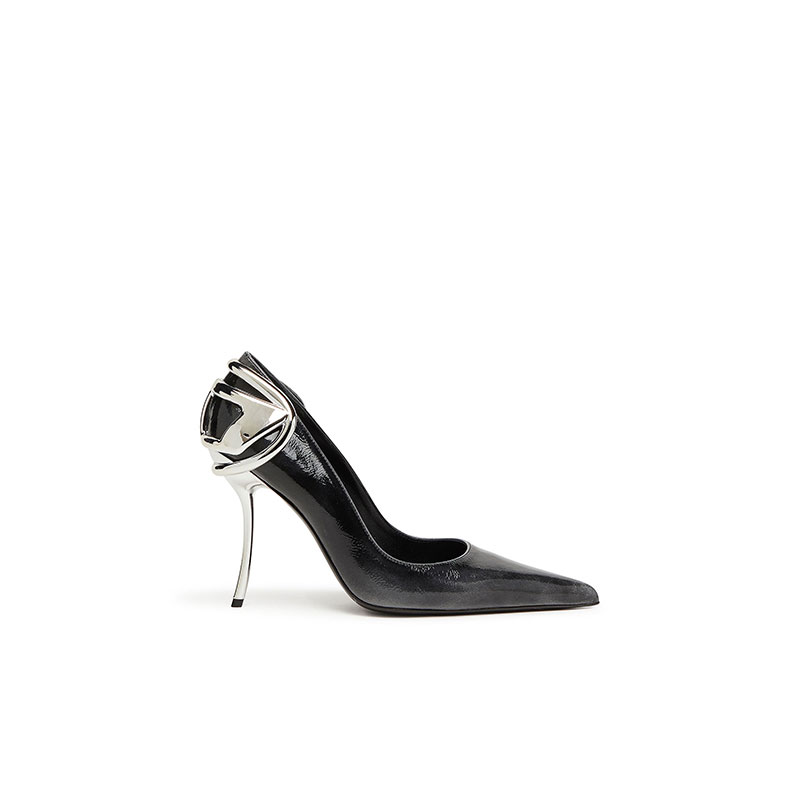A new iteration of the iconic Ten&Half stiletto, these point-toe pumps are made from patent bicolour pull-up leather. When stretched, the ultra-glossy material allows the colours to blend into a sleek black hue with a veil of smoky grey. The back of the shoe is a display of artisanal expertise, wrapped with silver chrome Oval D hardware that plummets into a showstopping 10.5cm heel with an elegantly curved profile.