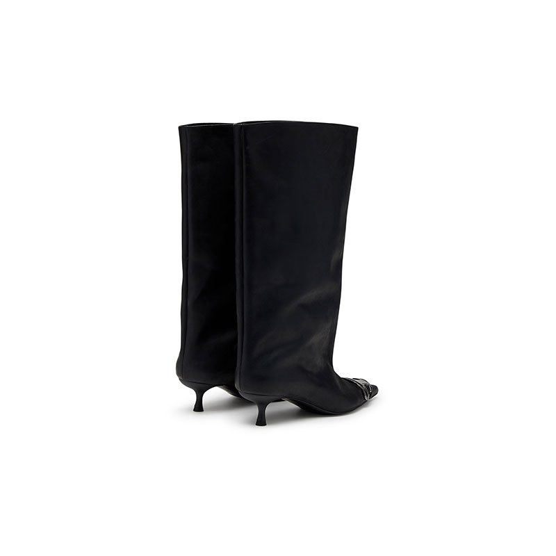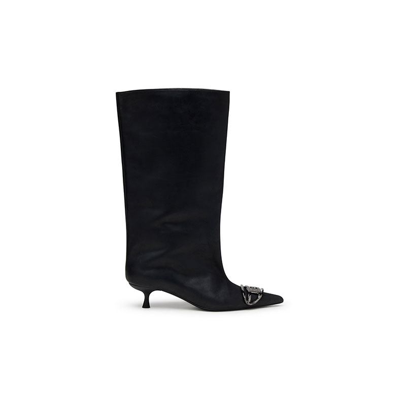 These women’s knee boots are an exclusive Fall Winter Runway style. Crafted in Italy from high-quality oiled leather with a rich, lived-in patina, they pair an ultra-wide shaft with a dainty pointed toe and 4cm kitten heel. The Oval D hardware – an expression of Diesel’s identity – is recoded with an oxidised, rusted effect, adding an instant rugged edge.