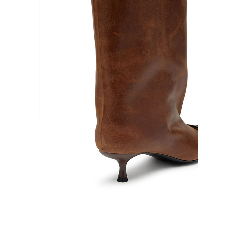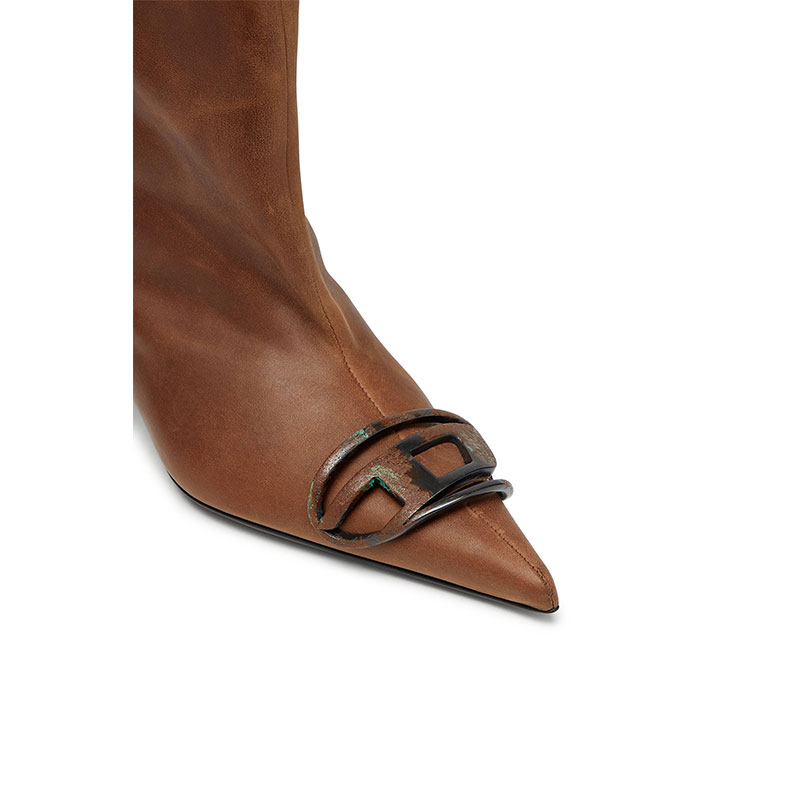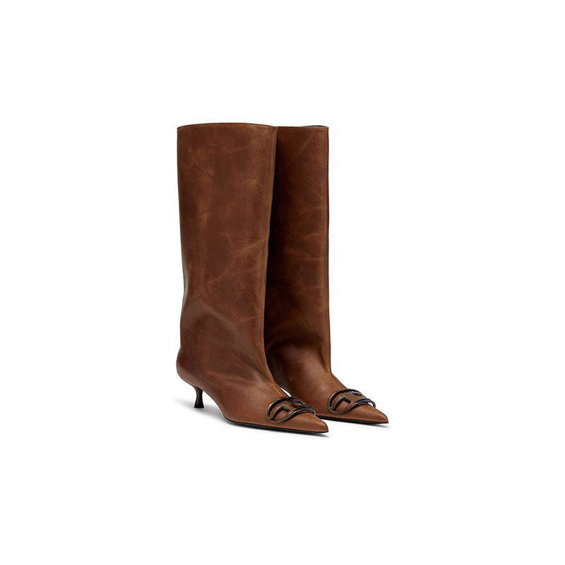 These women’s knee boots are an exclusive Fall Winter Runway style. Crafted in Italy from high-quality oiled leather with a rich, lived-in patina, they pair an ultra-wide shaft with a dainty pointed toe and 4cm kitten heel. The Oval D hardware – an expression of Diesel’s identity – is recoded with an oxidised, rusted effect, adding an instant rugged edge.