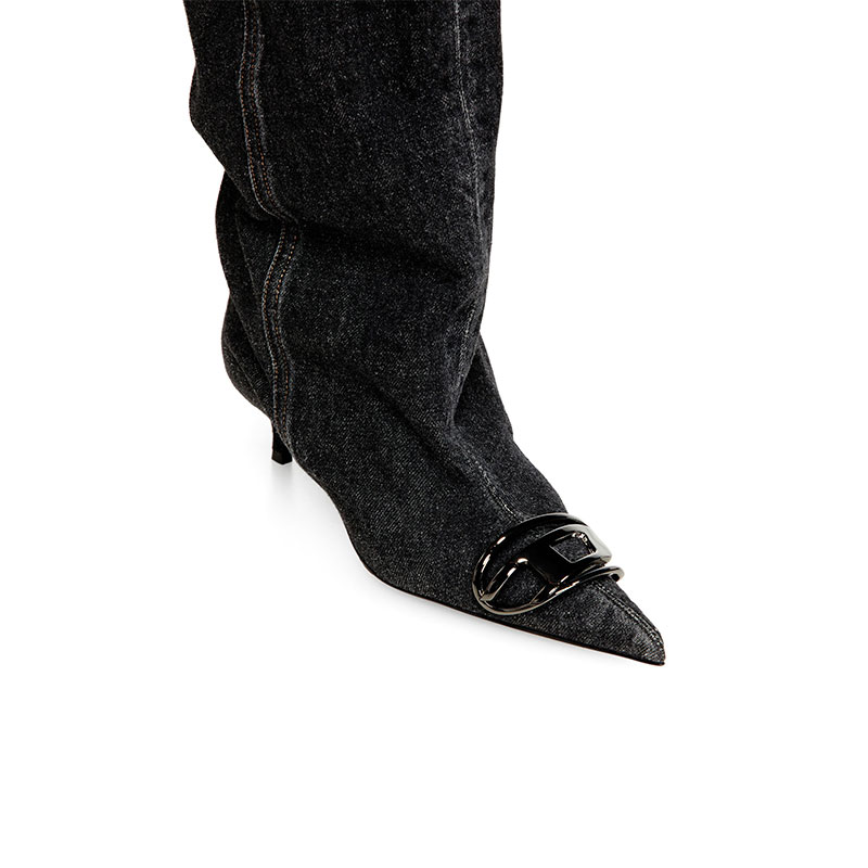 Slouchy in blue denim, this women's boot adapts to every mood. The knee-high shaft can be turned down to reveal its soft leather lining, scrunched for laissez-faire ease, or worn tall with a contemporary edge. Gunmetal-tone Oval D hardware defines the pointed toe. Set on a 4 cm kitten heel – elevated yet effortless – the shoe brings poise without the pinch.
