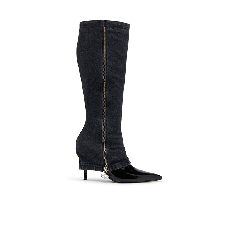 Innovation meets the spirit of the ‘80s. These women’s knee boots from the SS25 Runway Show are given a surreal twist through their game-of-trickery trompe l’oeil construction: the shaft in Diesel’s hero fabric – denim – gives the illusion of bootcut jeans. They’re crafted from glossy patent leather with sharply pointed toes and 9cm stiletto heels. The signature Oval D pull at the outer metal zip adds a subtle yet distinctive logo touch.