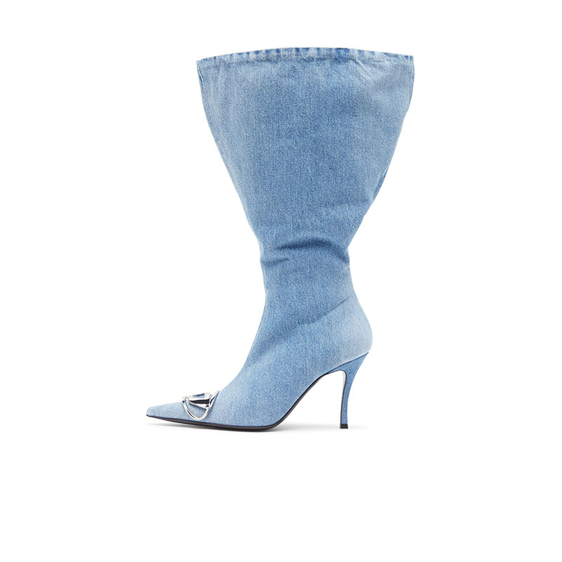 Designed with a wide shaft, this women’s knee-high boot is versatile and easy to wear, complementing barrel-leg jeans such as the 1974 D-ELLZ. Characterised by a pointed toe enveloped in a metal Oval D plaque, this shoe is crafted from signature Diesel denim in a blue wash and sits on a slim yet wearable 9 cm heel.