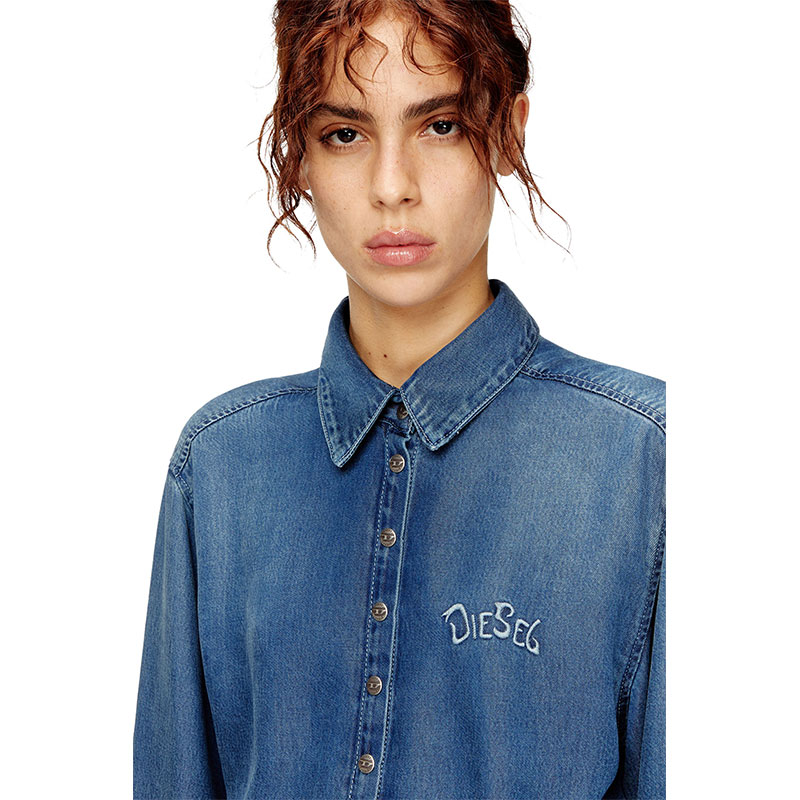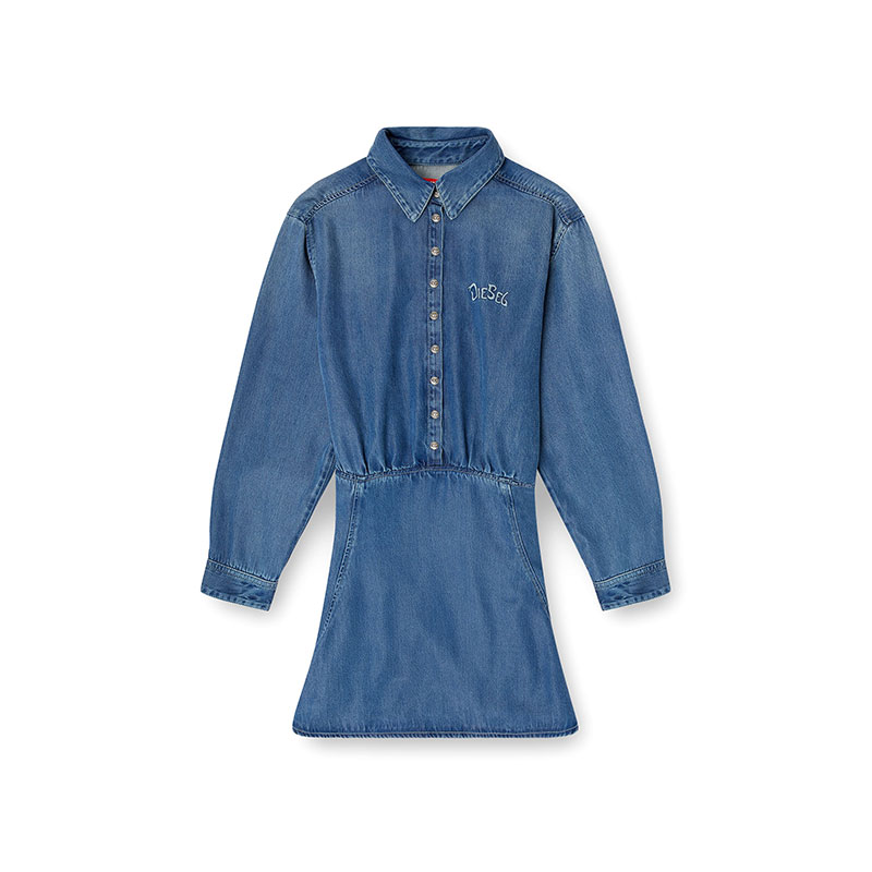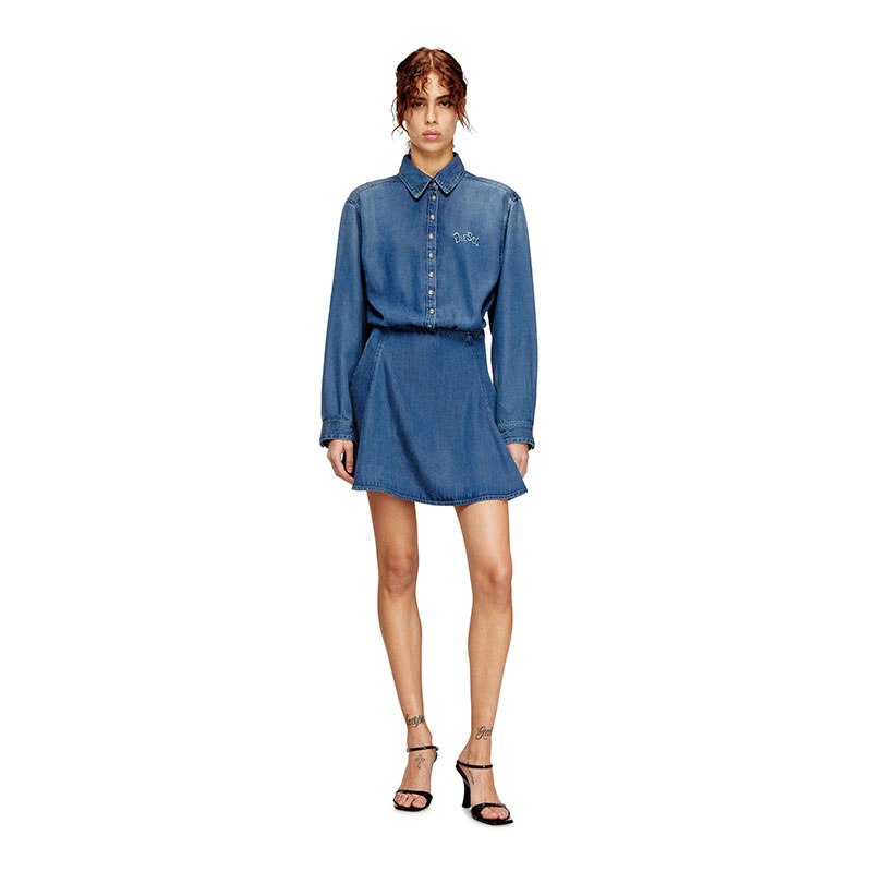 This mini dress is crafted from blue Lyocell denim with a light, fluid texture. The large embroidered patch on the back, featuring graffiti-style letters from the Diesel logo, makes it a unique statement piece.