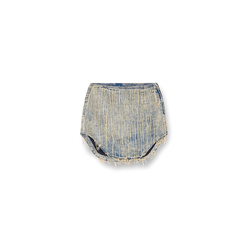 Cotton mini skirt featuring a high-waisted fit that enhances the silhouette. It is crafted for a unique distressed effect, accentuated by frayed details and raw cuts. The texture is further enriched by an original play of exposed threads.