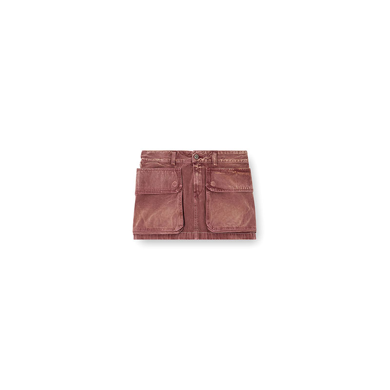 Cotton miniskirt with a worn effect. It features two large pockets applied at the front and a straight yoke at the back to give it structure. The jacron patch is applied on the back.