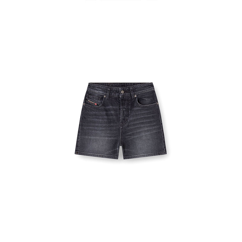 Women's denim five-pocket shorts cut to mid thigh, with a straight fit and medium waist. Crafted using partially recycled cotton, this fix denim features a black wash with subtle whiskers and tonal stitching.