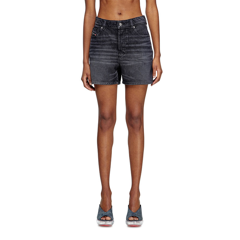 Women's denim five-pocket shorts cut to mid thigh, with a straight fit and medium waist. Crafted using partially recycled cotton, this fix denim features a black wash with subtle whiskers and tonal stitching.