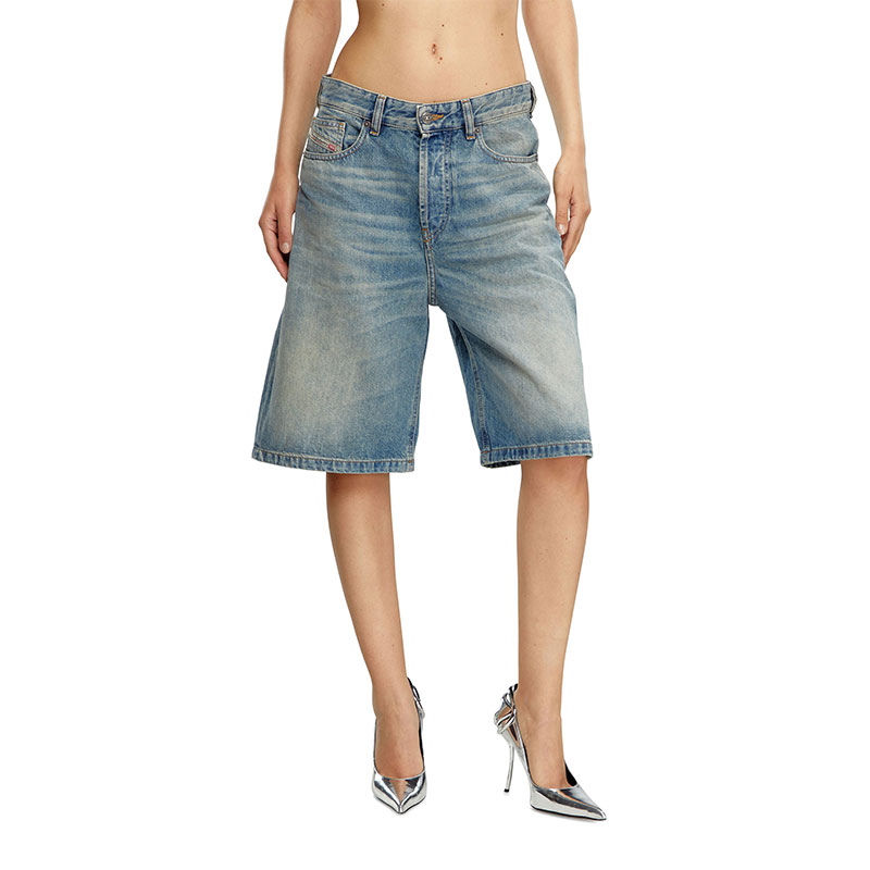 Women's denim five-pocket shorts with a relaxed-leg, knee-length fit.