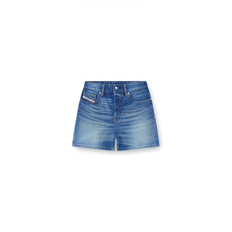 Women's denim five-pocket shorts cut to mid thigh, with a straight fit and medium waist. The style is crafted from fix denim in partially recycled cotton, and features a treated medium blue wash with a worn look.