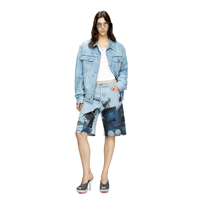Crafted from fix denim, this Spring Summer 2025 Runway wash is entirely distressed in Italy. A unique example of Diesel's know-how and innovative approach to denim, it features stonewashed and laser treatments to create whisker motifs. Hand-stitched fringes pair perfectly with the shades of the underlying fabric, creating a signature "trompe l'oeil" look that blurs the line between 2D and 3D.