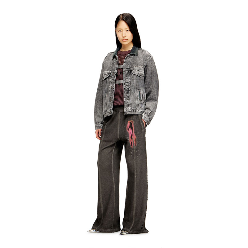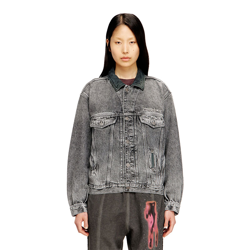 A bold reinterpretation of archival design, this trucker jacket channels '80s aviator energy with its oversized shoulders and slightly cropped, slim-cut hem. It's crafted from grey cotton and hemp denim, stonewashed and treated with bleach effects that enhances the raw look and feel. The tonal leather collar and embroidered Diesel Industries logo complete this iconic style, fusing a retro attitude with contemporary edge.