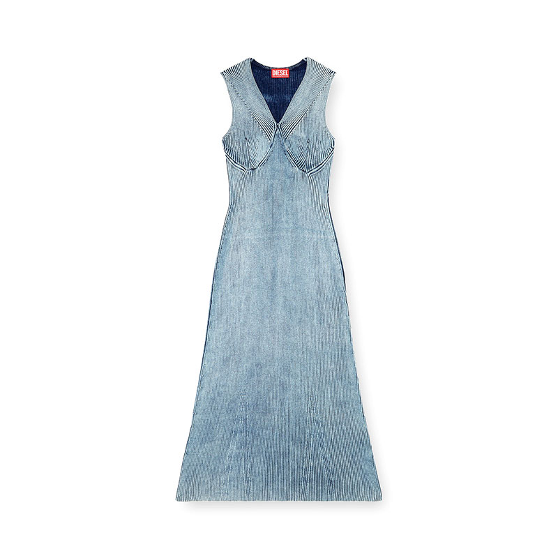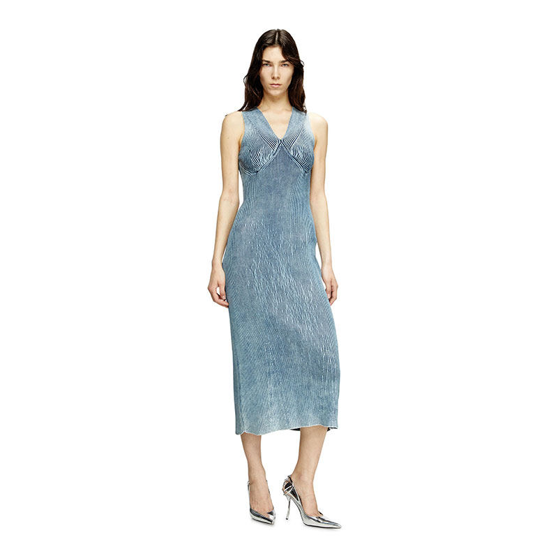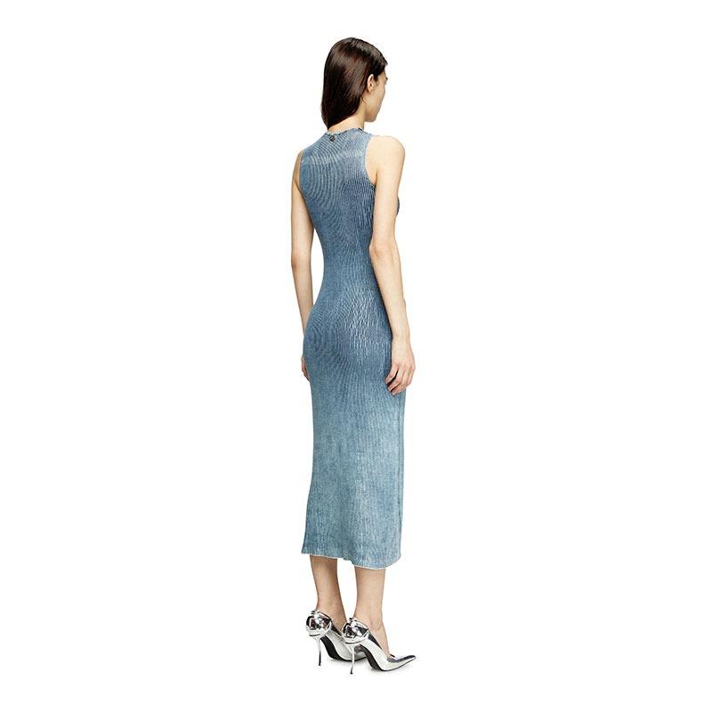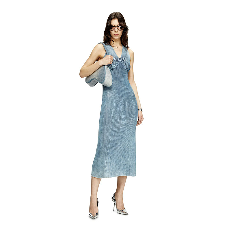 Women’s midi dress in a body-skimming ribbed knit spun from indigo denim yarn. Structured to highlight the V-neck and bust, the knit is stonewashed for a lived-in, marbled effect and amped up with a transparent Mylar foil coating that adds shine and luminosity. The metal Oval D plaque on the back is a subtle logo embellishment.