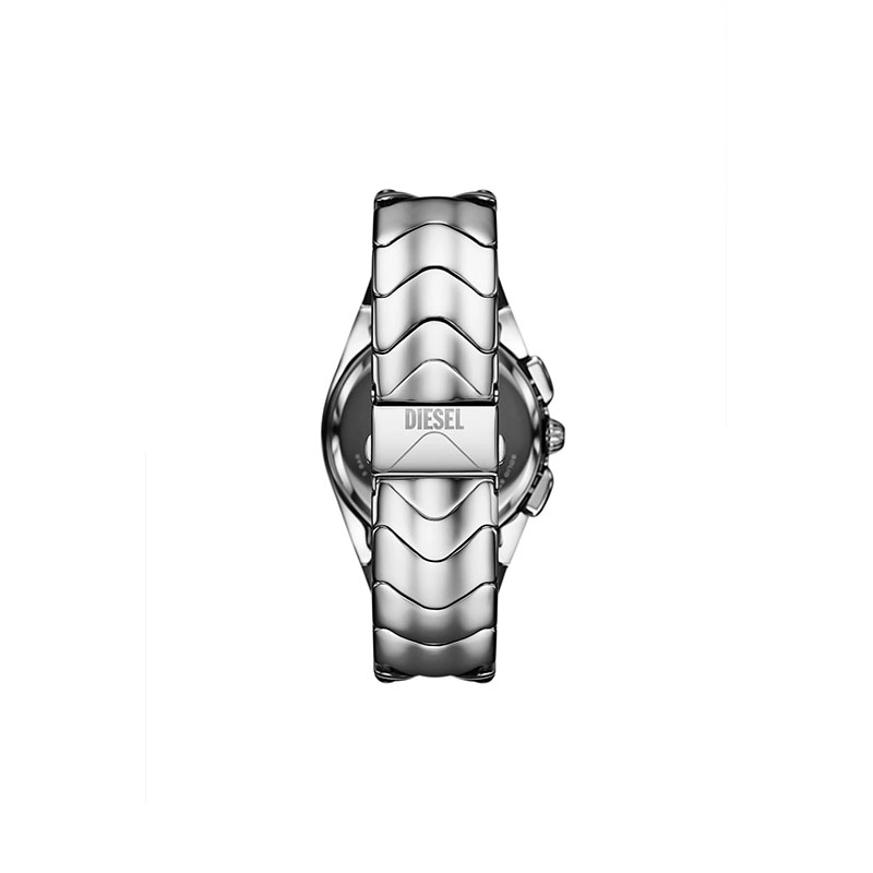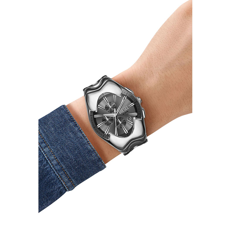Diesel's 45mm Mercurial watch features a gray sunray dial, chronograph movement, and a polished silver stainless steel bracelet.