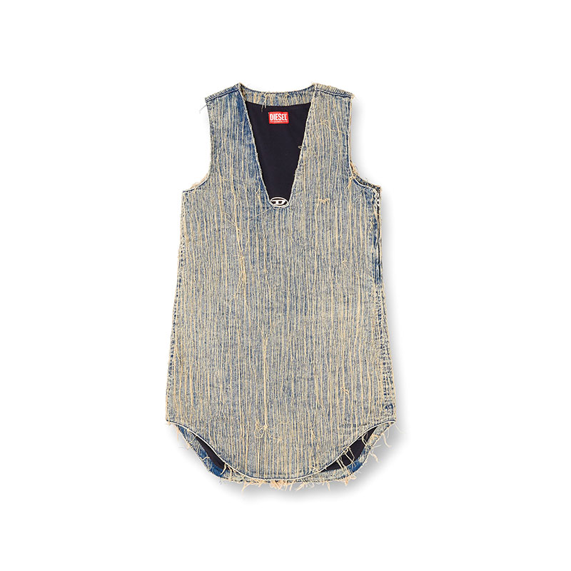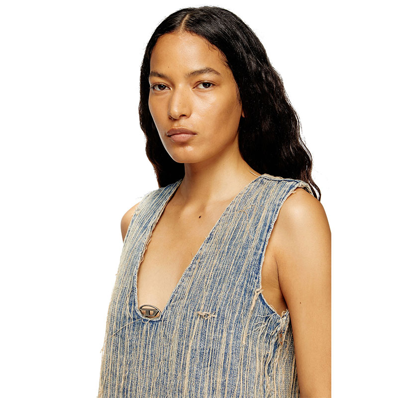 Sleeveless mini dress with regular fit. Made of cotton featuring distressed effects and raw cut edges. The V-neck is enhanced by the Oval D logo.