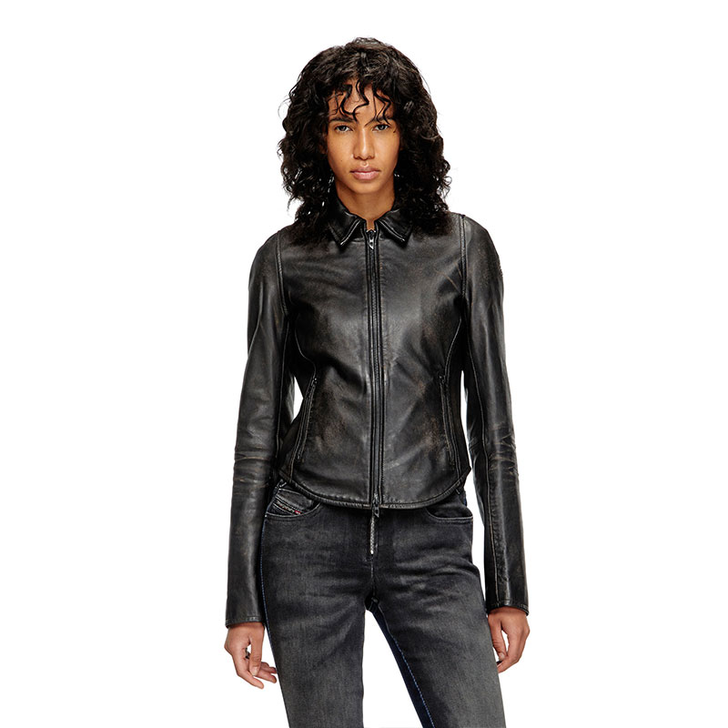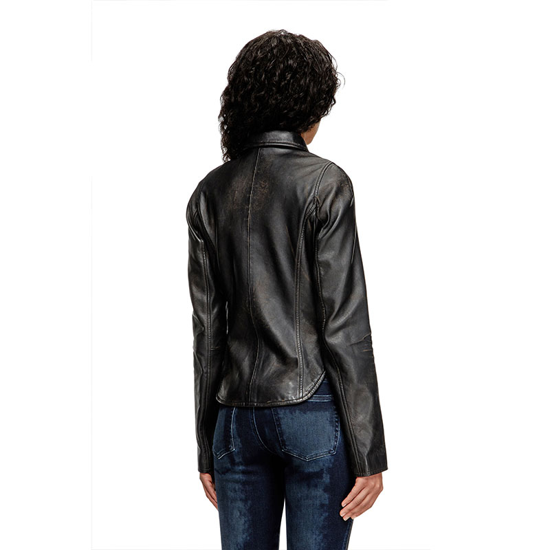 Women's fitted jacket with a pointed collar and curved hem. Crafted from responsibly sourced leather dyed a deep shade of brown, this distressed style has a broken-in feel, courtesy of fading and scuffs that reveal lighter undertones of the hide. It’s hallmarked with an embossed Oval D logo on the sleeve and fully lined for smooth layering.