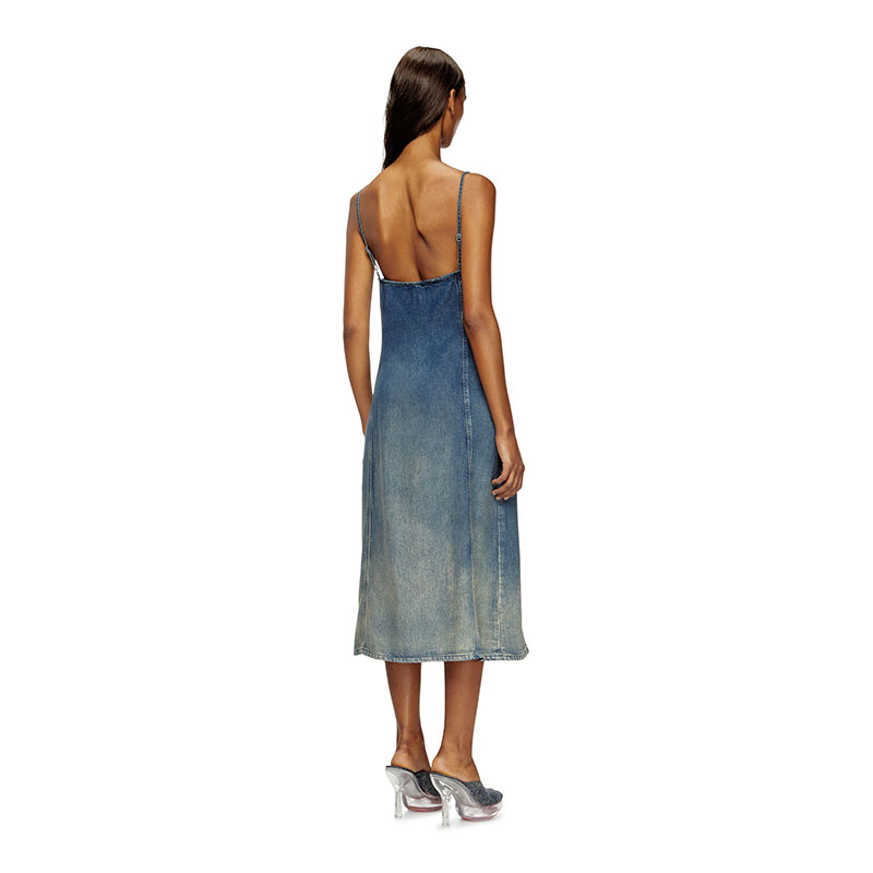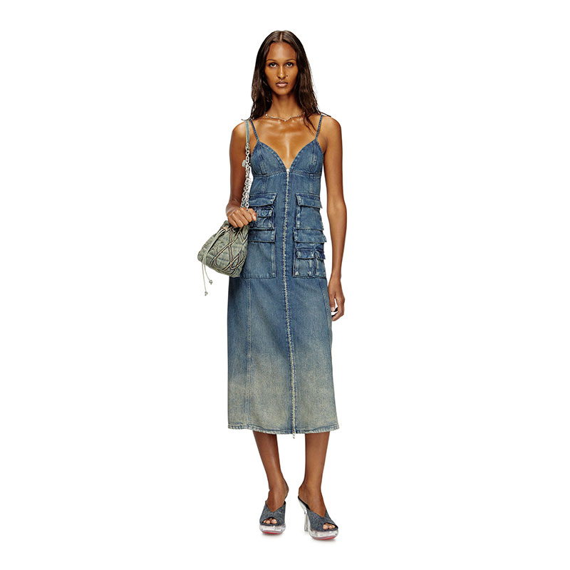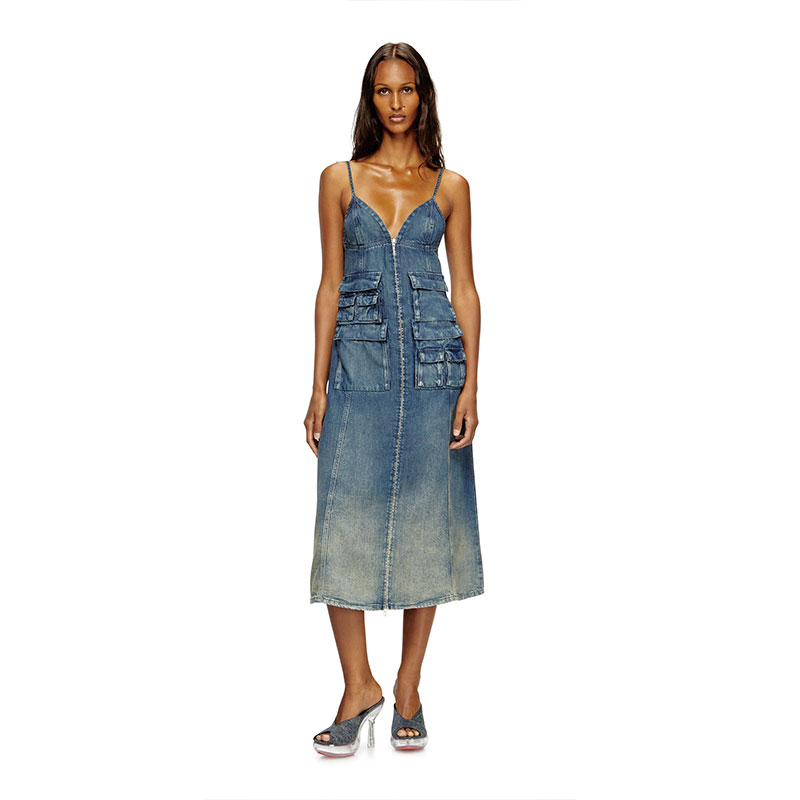 This women's mid-length dress is designed with a straight, empire-waist silhouette. The style features thin, adjustable shoulder straps and a front zip that's both decorative and functional. Cargo pockets add a signature utilitarian twist.