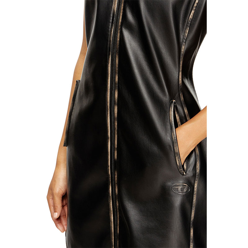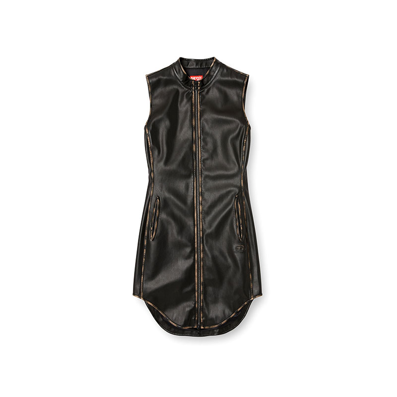 This women's full-zip mini dress features a rounded hem that takes cues from men's shirts. Made from shiny black technical fabric inspired by biker styles, it's been hand-brushed to remove some of the tint along the edges for a worn look. Cut in a sleeveless slim fit.