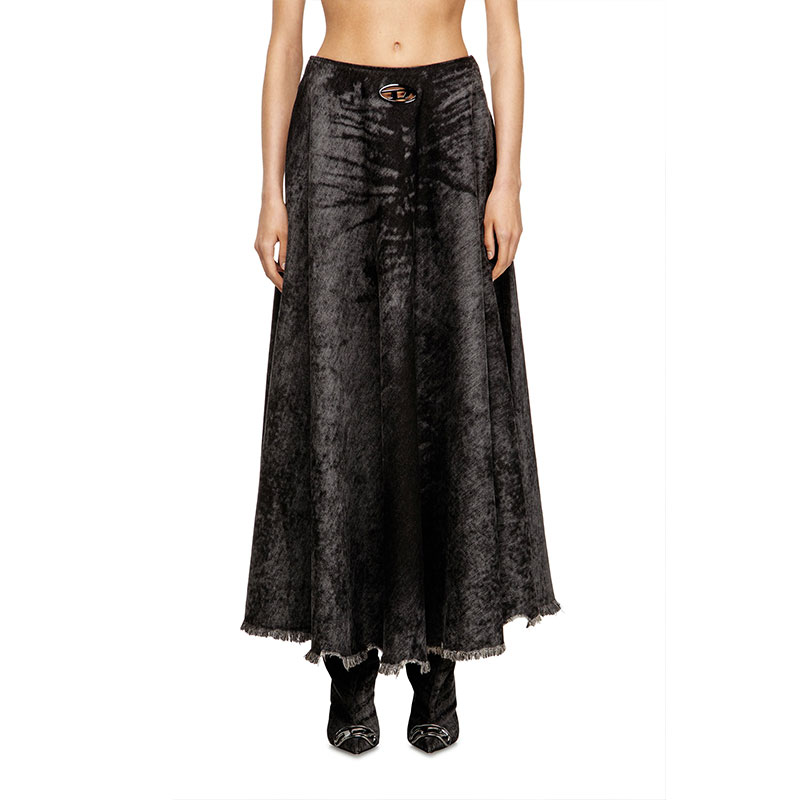 The metallic Oval D in the centre of this women's long skirt has become part of Diesel's style codes. Heavily frayed hems complete the Fall Winter 2025 Runway look.