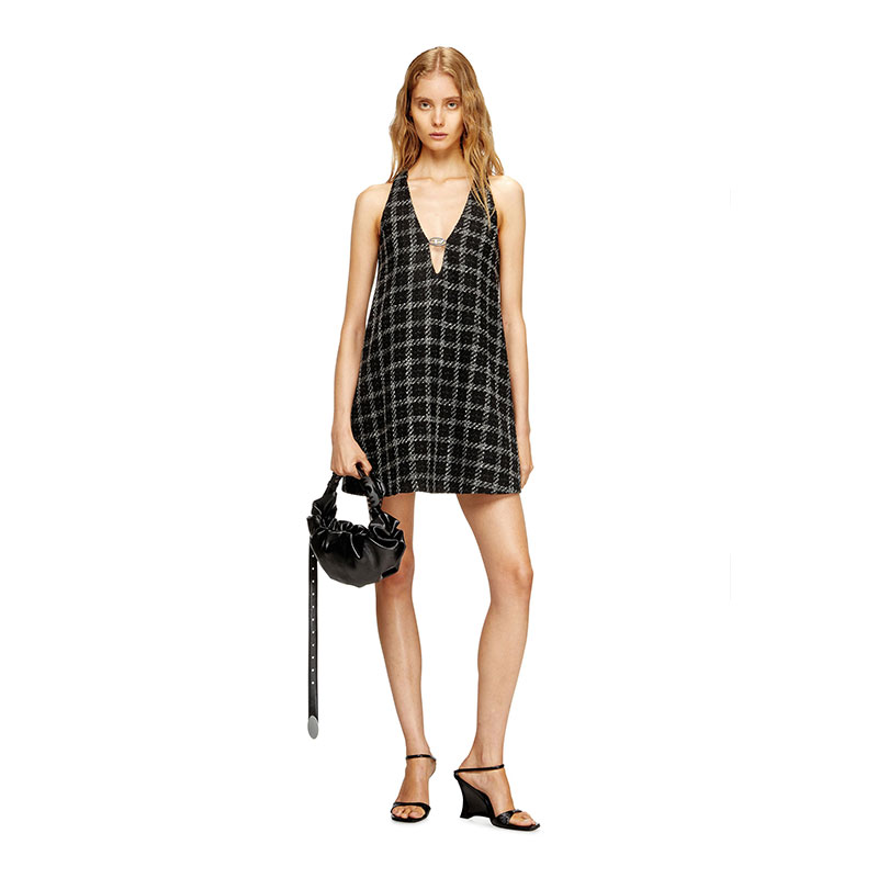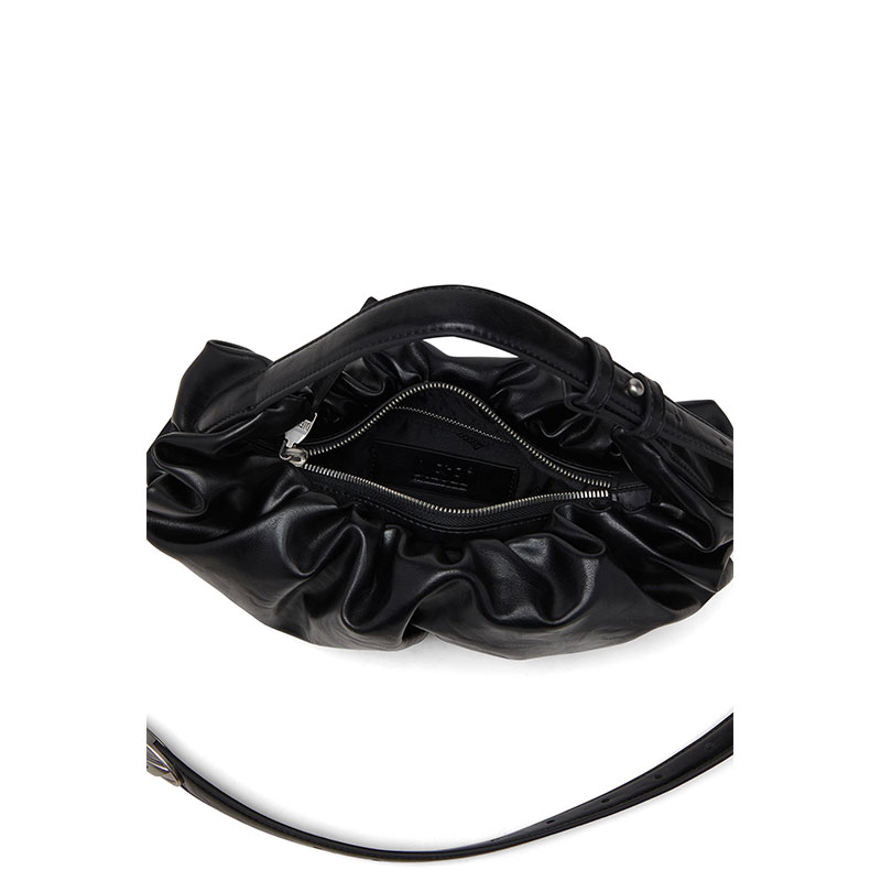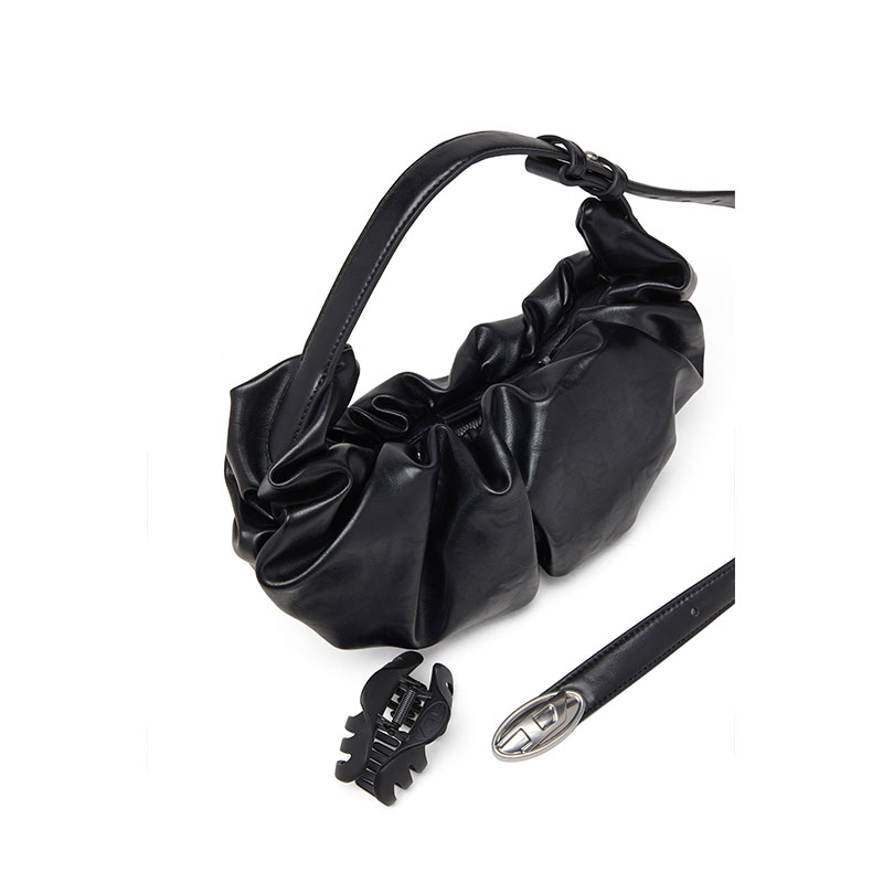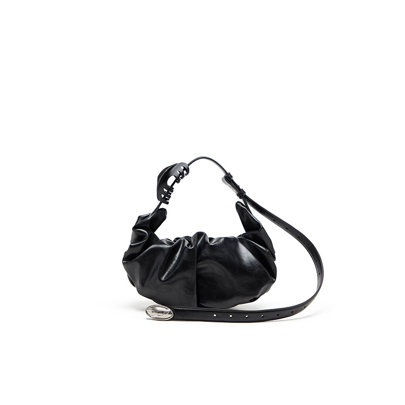 An exclusive FW25 Runway Show style, this women's small handbag boasts a slouchy hobo silhouette, gathered along the zip for a scrunched effect. Exquisitely soft and shiny, our women’s hobo bag features an innovative belt-inspired handle punctuated with a hair clip. The handle extends into a dangling strap, showcasing the resin Oval D at the tip. Carry it by the top handle or over the shoulder.