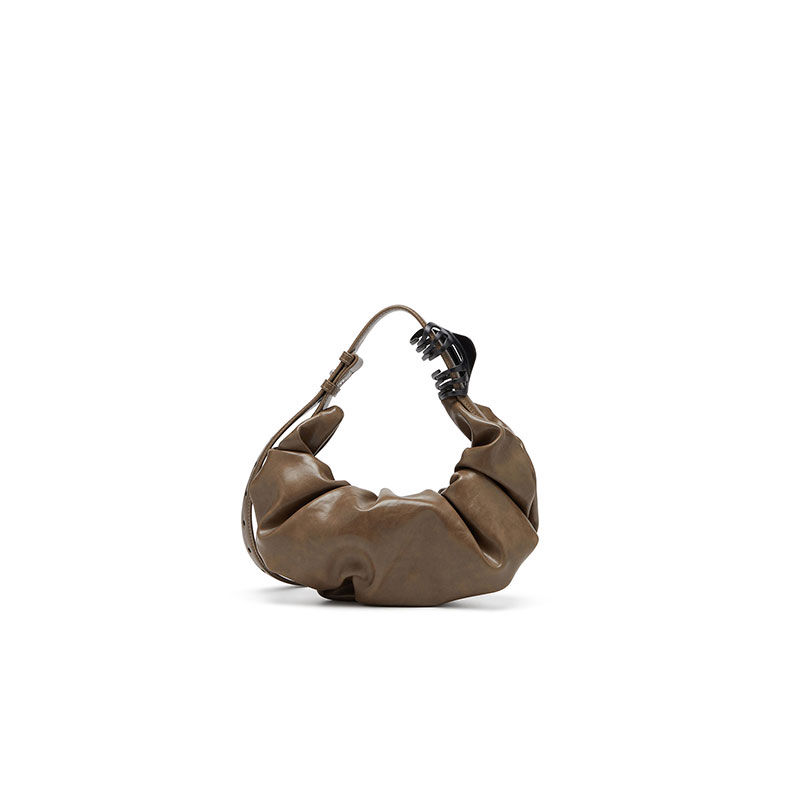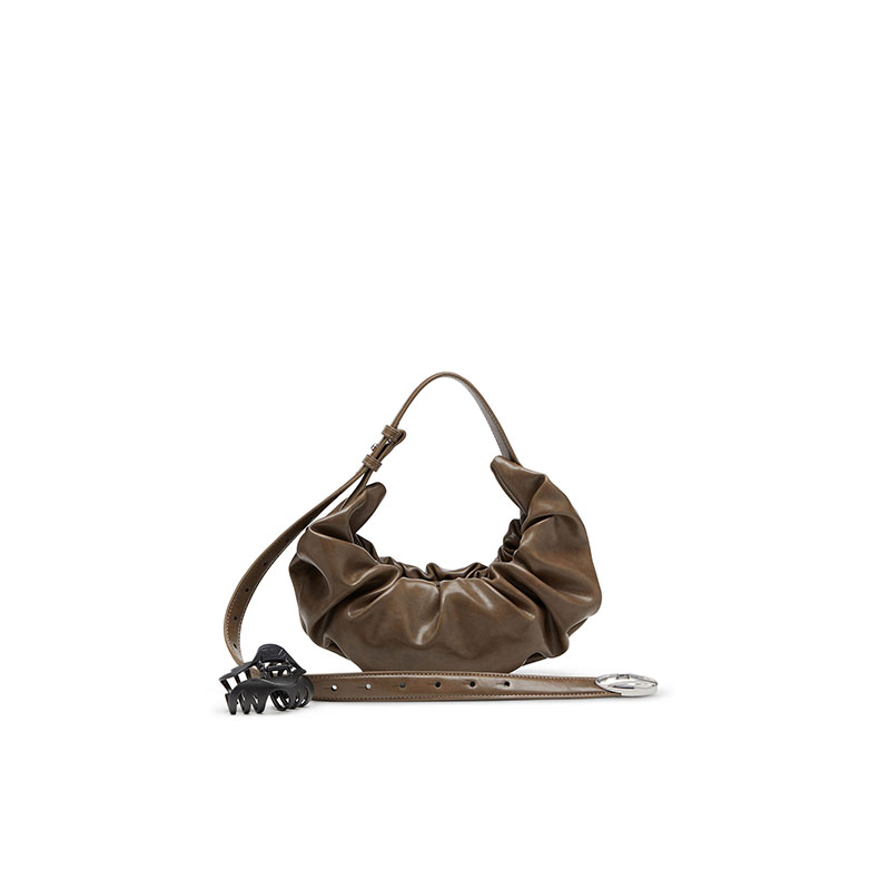 An exclusive FW25 Runway Show style, this women's small handbag boasts a slouchy hobo silhouette, gathered along the zip for a scrunched effect. Exquisitely soft and shiny, our women’s hobo bag features an innovative belt-inspired handle punctuated with a hair clip. The handle extends into a dangling strap, showcasing the resin Oval D at the tip. Carry it by the top handle or over the shoulder.