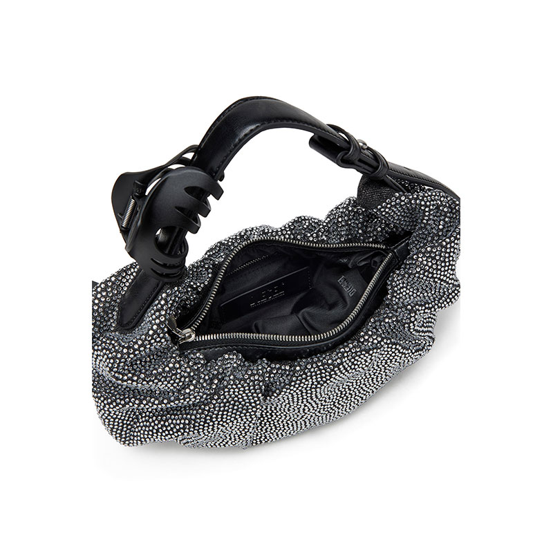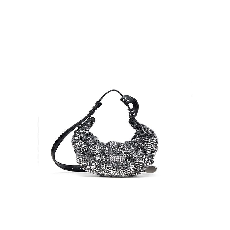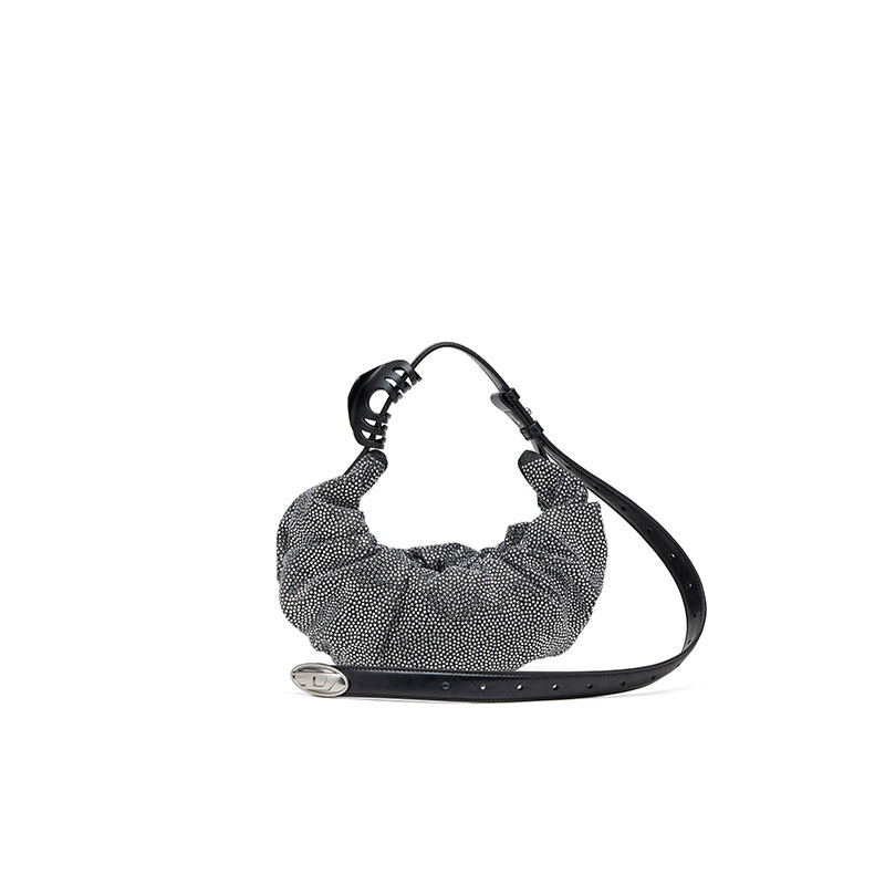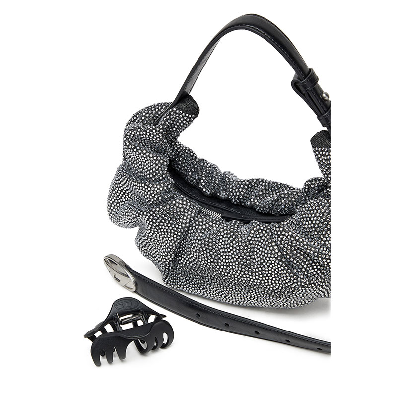 Women’s small handbag with a slouchy hobo silhouette. Gathered along the zip for a scrunched effect, this exclusive FW25 Runway Show piece is crafted from black-wash denim embellished with light-catching crystals. The innovative belt-inspired handle accessorised with a hair clip is a signature detail of this style. The handle extends into a dangling strap, showcasing the resin Oval D at the tip. Carry it by the top handle or over the shoulder.