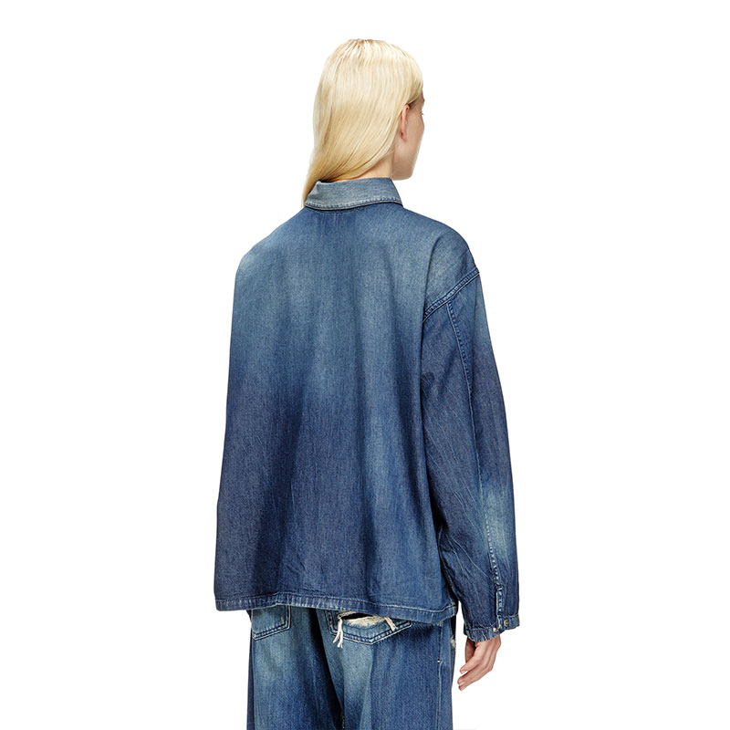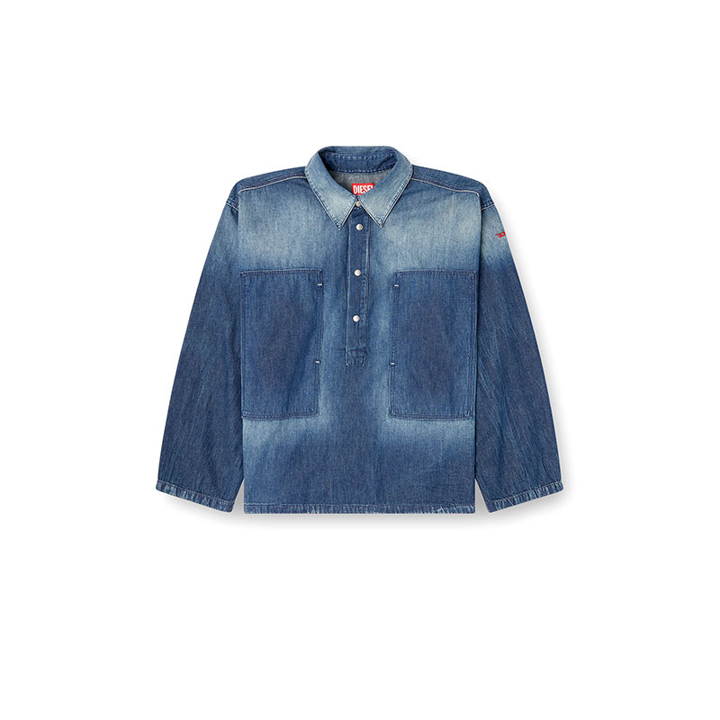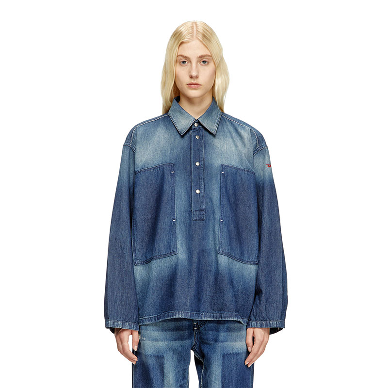 This women's long-sleeve top is cut to a boxy fit. It features a polo neckline with branded metal snap buttons, and wide patch pockets on the chest that open on the side. A small red D logo is embroidered on one sleeve. A tribute to Diesel’s experimental attitude, this medium blue wash undergoes a unique patch-effect treatment to create daring light and dark motifs. Patches are placed in key areas before sanding, stone washing, and spraying are applied, creating a clear-cut contrast once removed. Final touches like distressing and a used, dirty effect enhance its worn-in character.