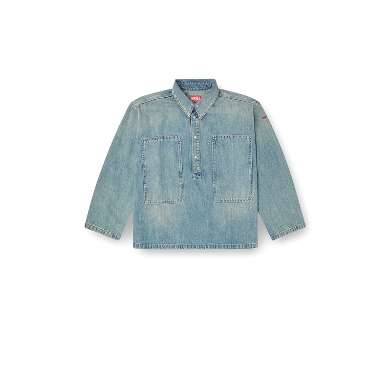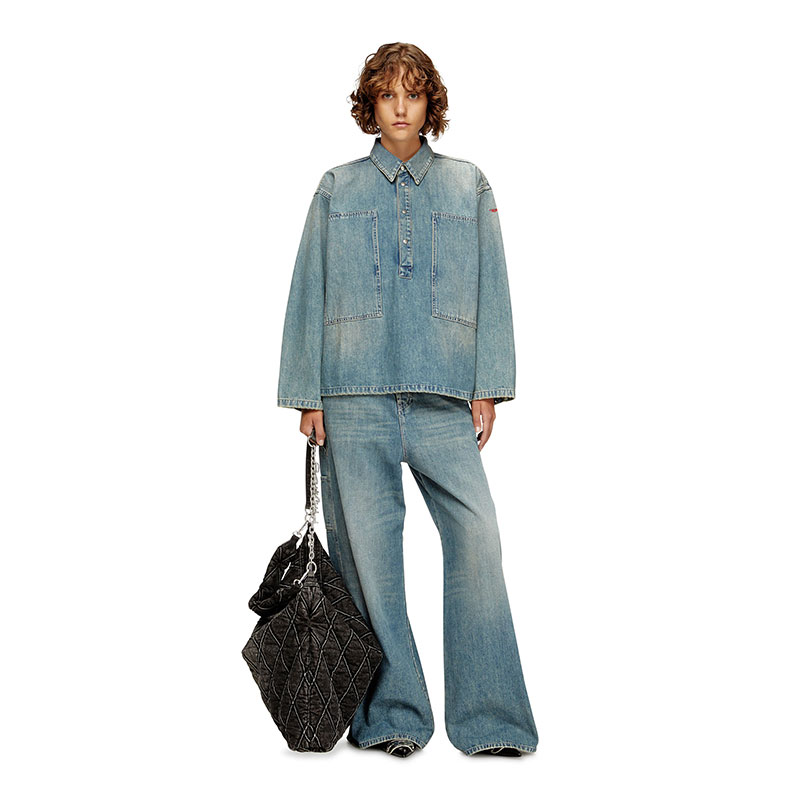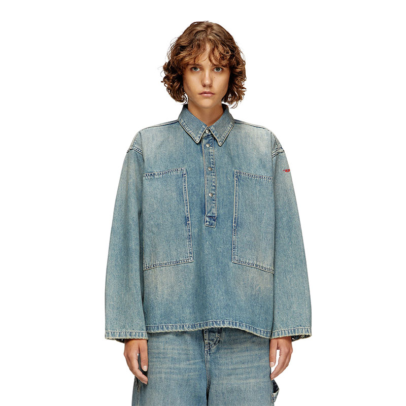 This women's long-sleeve top is cut to a boxy fit. It features a polo neckline with branded metal snap buttons, and wide patch pockets on the chest that open on the side. A small red D logo is embroidered on one sleeve.