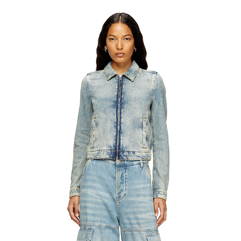 Women's jacket featuring a slightly cropped silhouette that nods to trucker styles. It features a shirt collar and a front zip with "D" shaped pullers. The pockets and cuffs are fastened with hidden snap-buttons.
