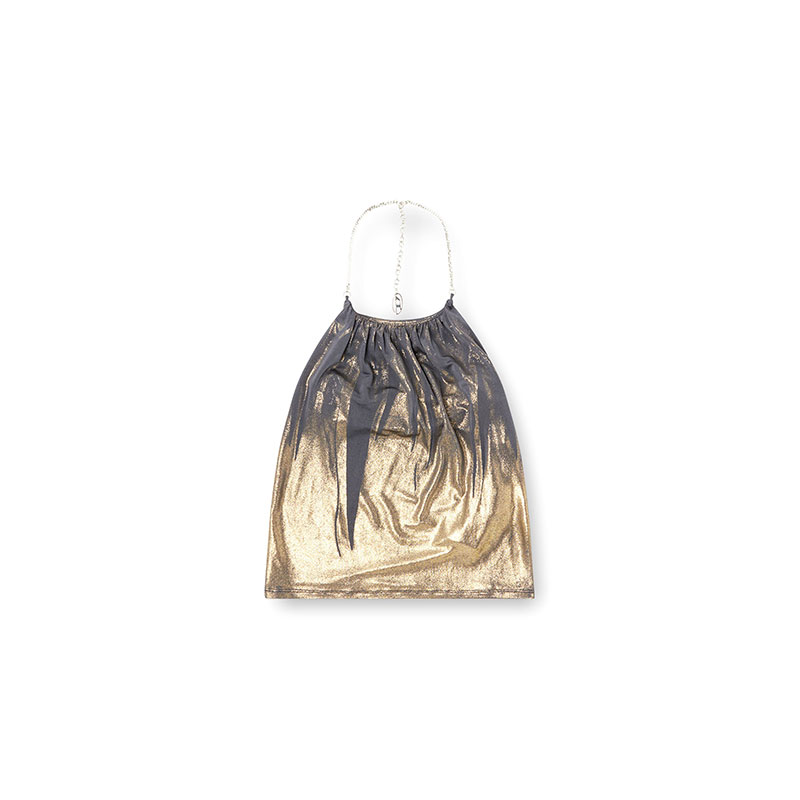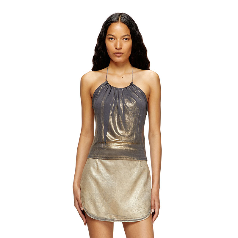 Slim fit halter top with a ruched front neckline, closed with an elegant chain necklace embellished with the Oval D logo. Made from stretch fabric, it enhances the silhouette. The unique workmanship creates a luminous effect.