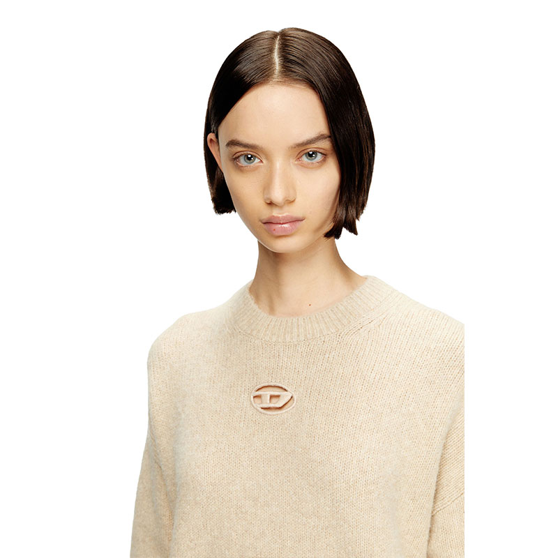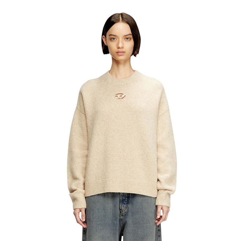 This women’s sweater is knitted from a soft and insulating blend rich in responsibly sourced wool and alpaca. It's shaped with dropped shoulders and features an unconventional logo twist – the cut-out embroidered Oval D on the front reveals flashes of skin or any layer beneath.