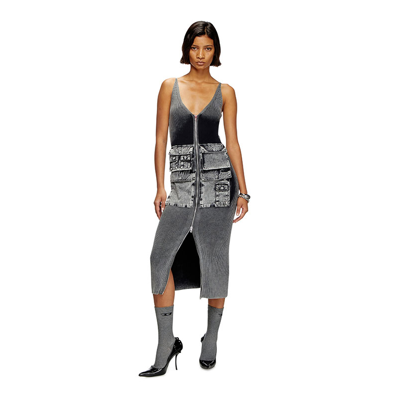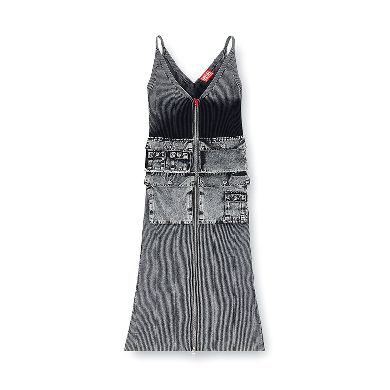 Women’s knitted dress for the utilitarian city dwellers. Made from black ribbed cotton knit that plays with saturation and fade, this midi has a figure-hugging shape juxtaposed with cargo pockets in marbled-effect fabric. The two-way zip cutting through the front adjusts the coverage at the V-neck and hem. Note the signature red lacquered D pull.