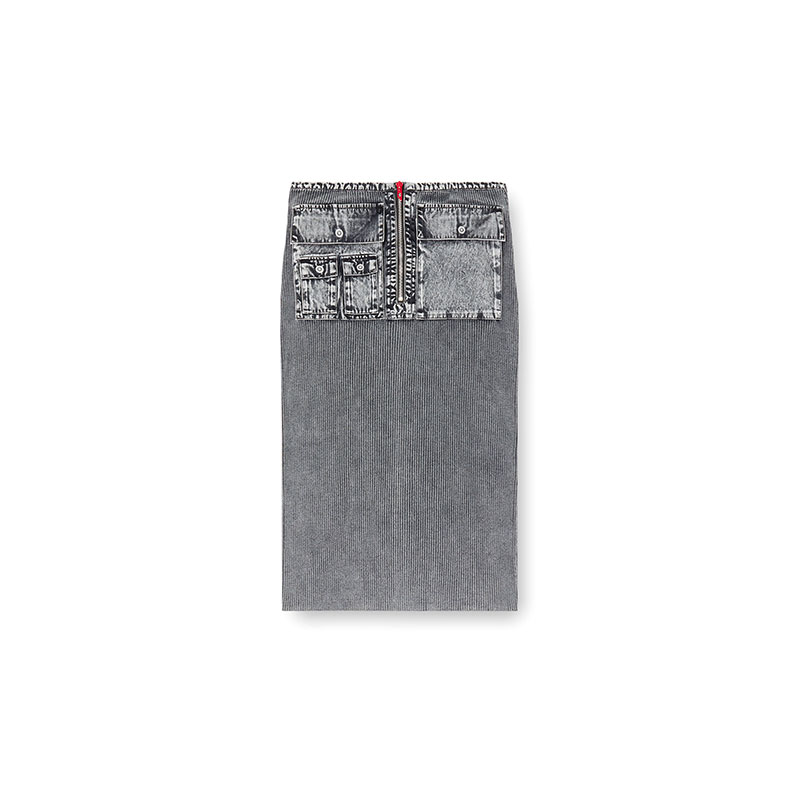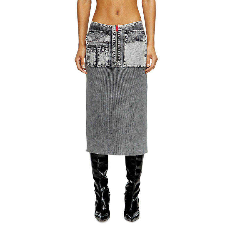 A classic silhouette meets utility in this women’s pencil skirt. Treated to created an irregular fade, it's made from ribbed cotton knit, with the trims and cargo pockets in marbled-effect denim. The short exposed zip fitted at the front is finished with a signature red lacquered D logo pull.