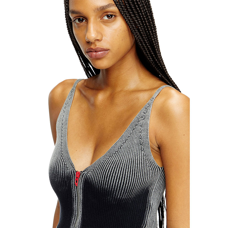 Cargo pockets in marbled-effect denim underscore the utilitarian edge of this women’s knitted tank. Made from a black ribbed cotton knit with a cool dégradé fade, it has a double V-neckline and zips through the front. The red lacquered D logo pull adds a signature touch.