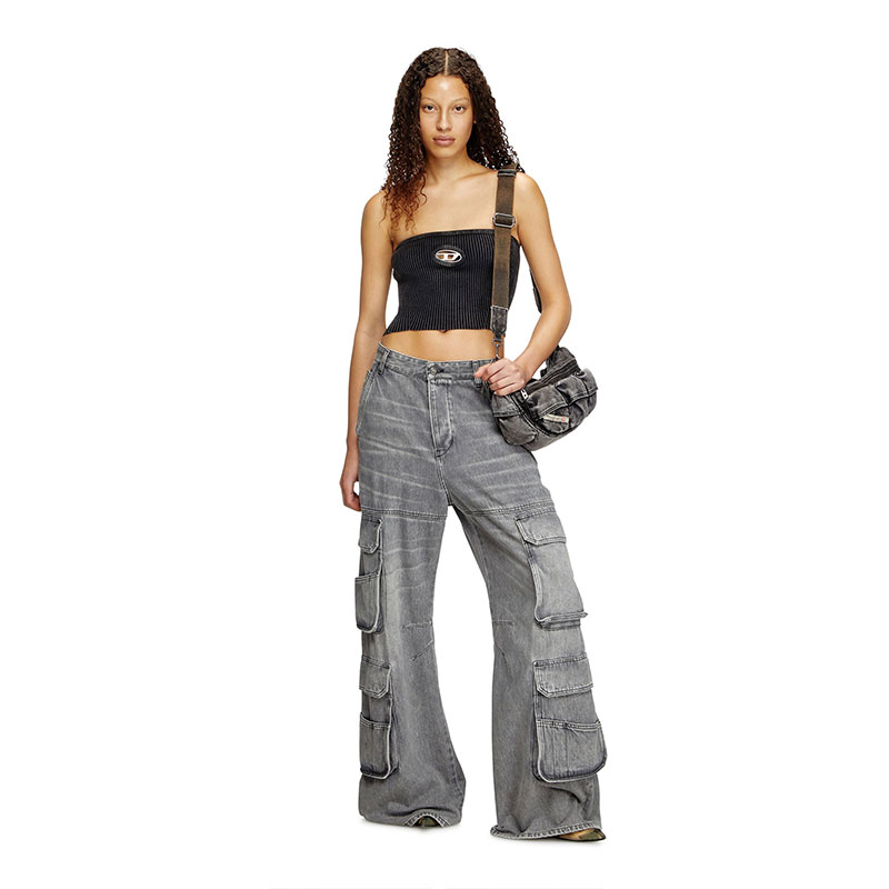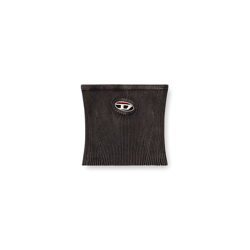This women’s rib-knitted top is embellished with metal Oval D hardware directly over the bust – the cut-out design reveals slivers of skin. Crafted using black denim yarn spun with organic cotton, it has a strapless, tube silhouette and a subtly faded finish.