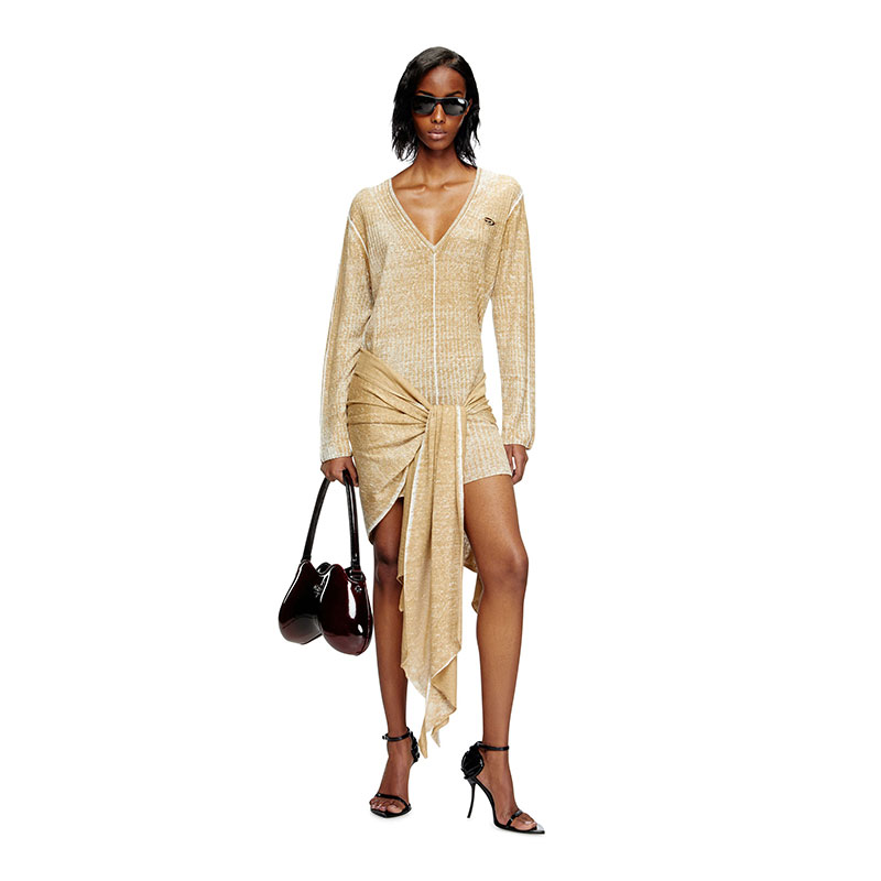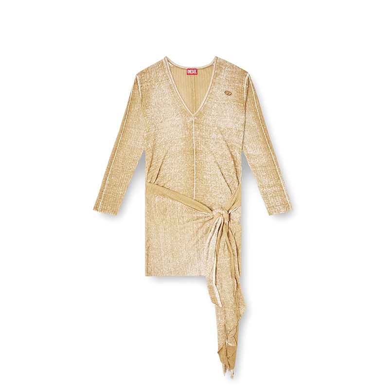 Knitted from lower-impact flax yarn, this long-sleeve dress features raw edges and fading for a dishevelled effect. Its loose shape has a slouchy feel, juxtaposing a ribbed V-neck top with a plain-knit wrap skirt. Cut-out Oval D on the chest.