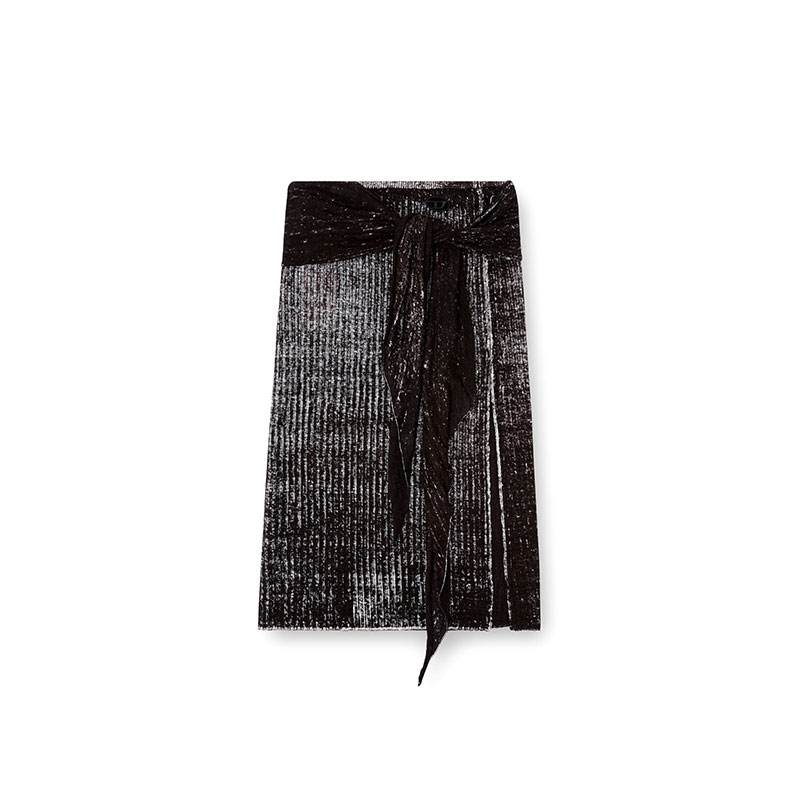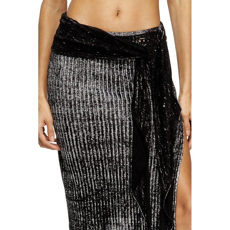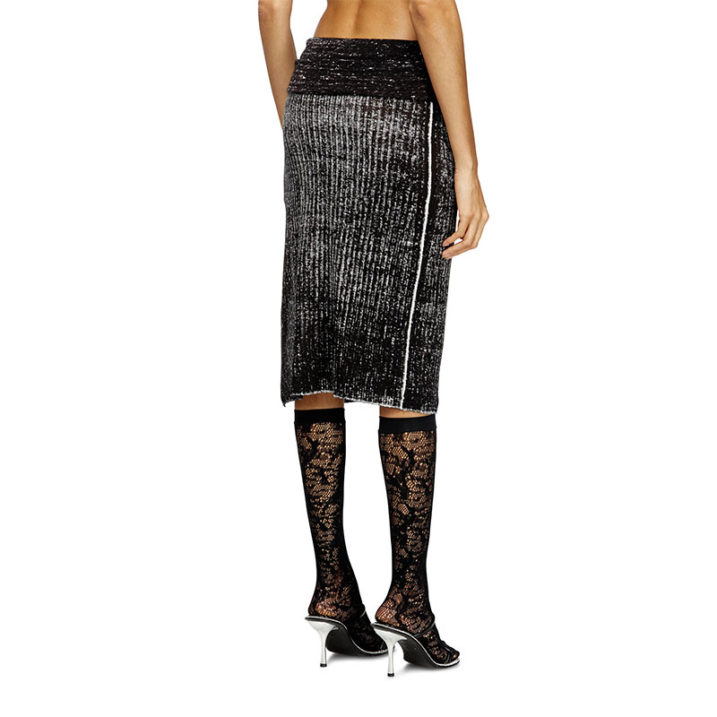This black midi skirt is knitted from lower-impact flax fibres. Featuring a wrap detail tying at the hip and a thigh-high slit, it's been dyed to leave fading along the ribbing for a worn look. An embroidered Oval D cut-out shows some skin.