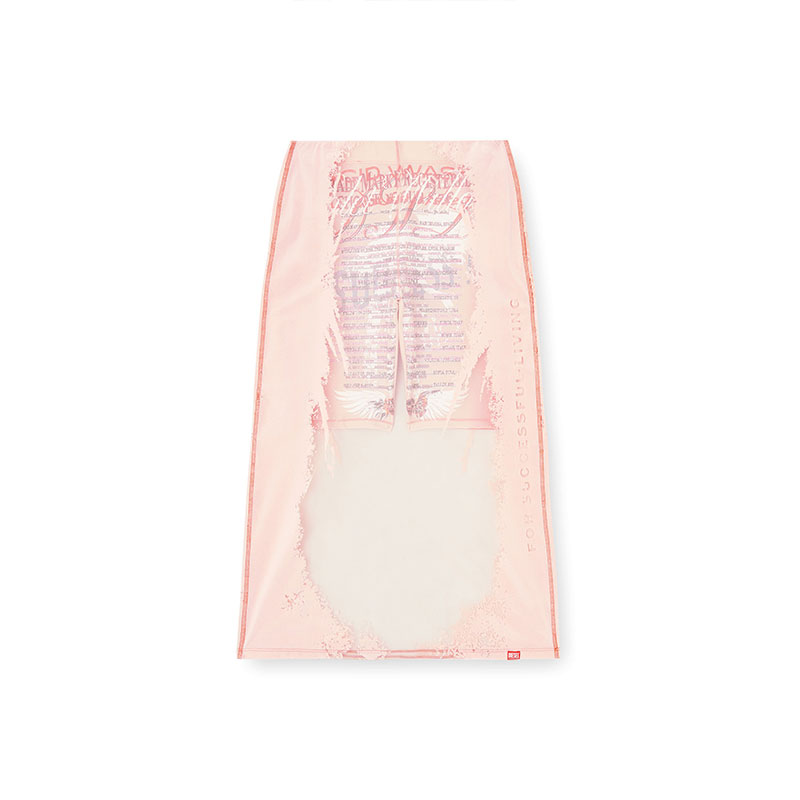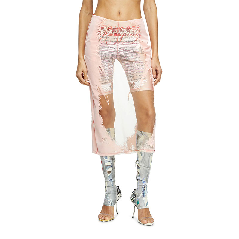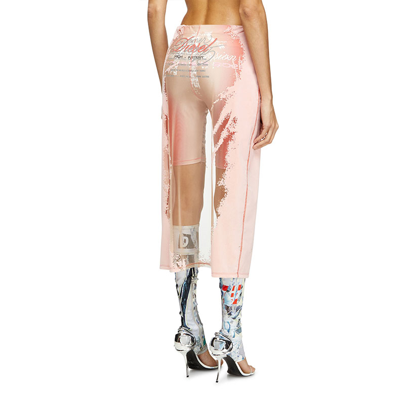 Diesel confirms its ties to club and rave culture with the Remaster collection. This women's midi skirt is cut from sheer technical mesh, enriched with distinctive artwork that nods to Diesel's unique distressed vibe and paired with tonal spandex cycling shorts. Each piece from the capsule is printed with custom graphics.
