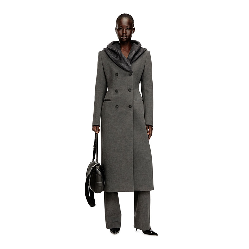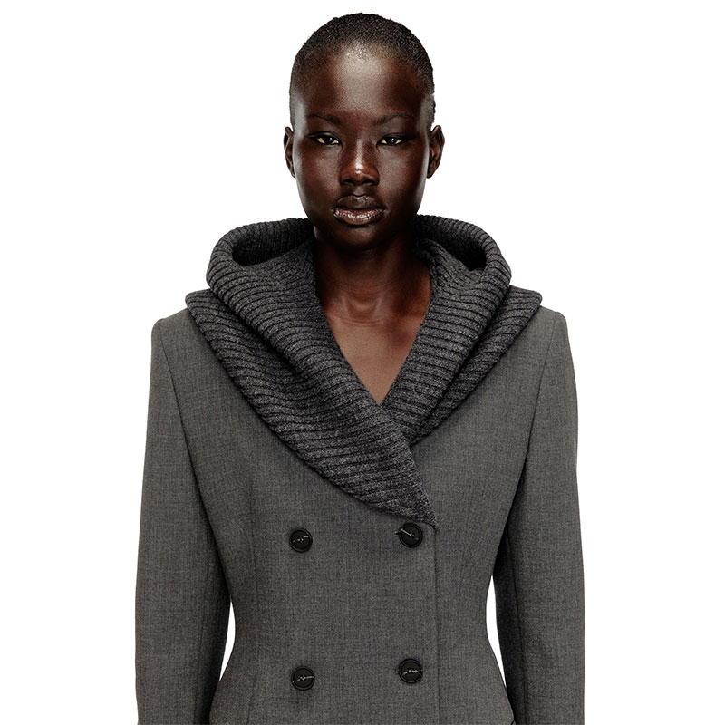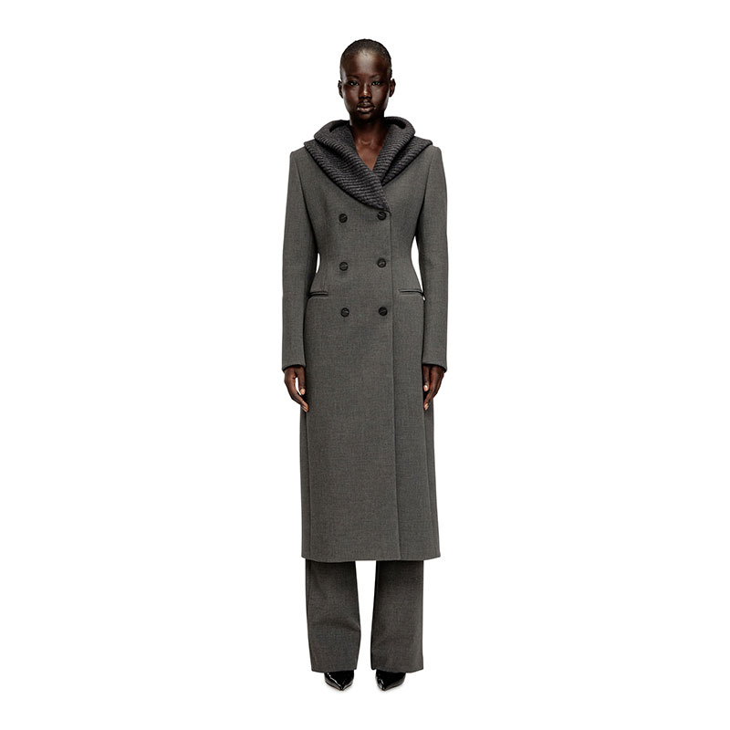 Tailoring, subverted with fluid ease. This women’s long coat is cut to a striking hourglass silhouette and topped with a cowl hood – rib-knitted from virgin wool, the headpiece adds a dramatic drape as it morphs into lapels. Rubber-touch faux-horn buttons fasten the double-breasted front, while a subtle metal Oval D plaque accents the back.