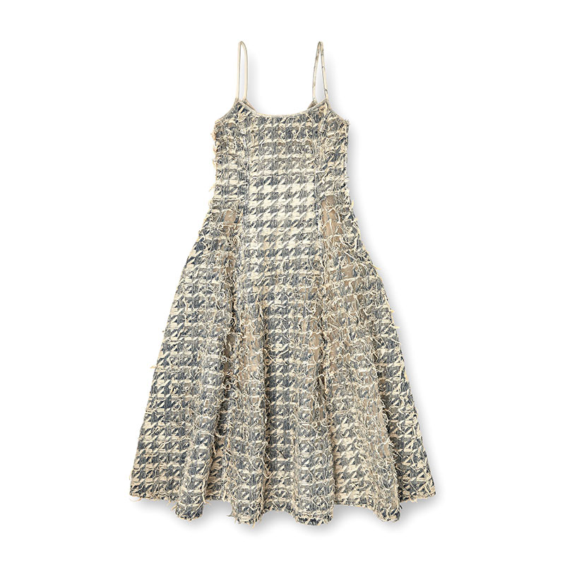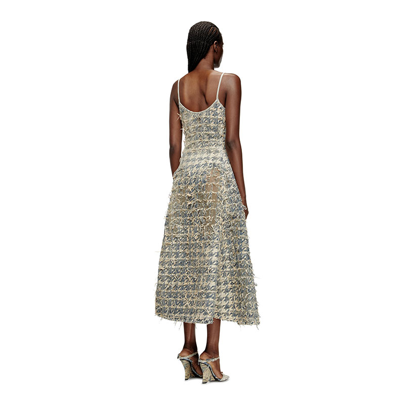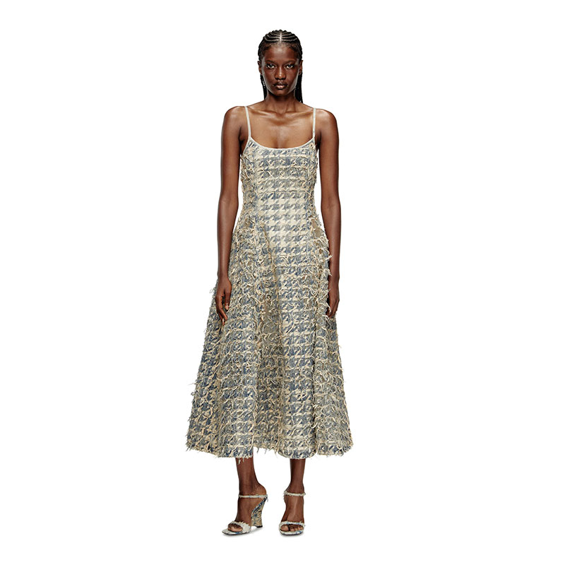 This women's long dress channels a haute-couture feeling, featuring a strappy top and a full, flowing skirt. Diesel's unique expertise in deconstructing denim lends this Fall Winter 25 Runway style an ethereal touch: the technical denim features a houndstooth jacquard weave, while the signature devoré technique reveals the inner construction of the fabric. Floating threads add texture for an inside-out effect.