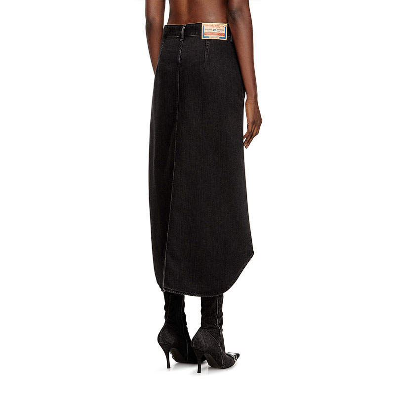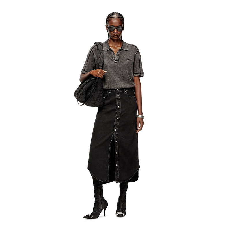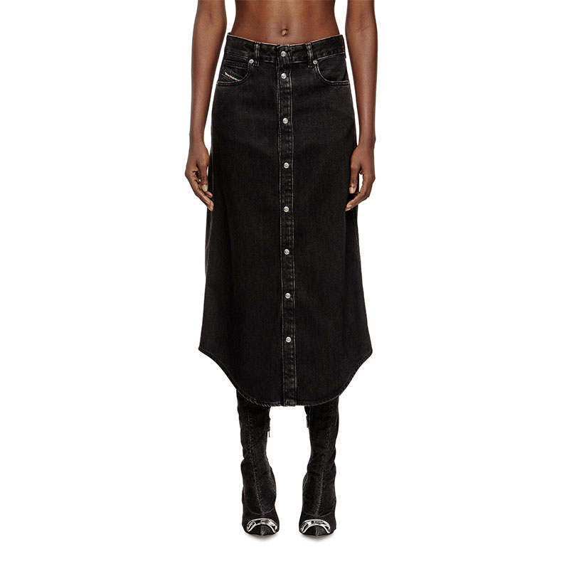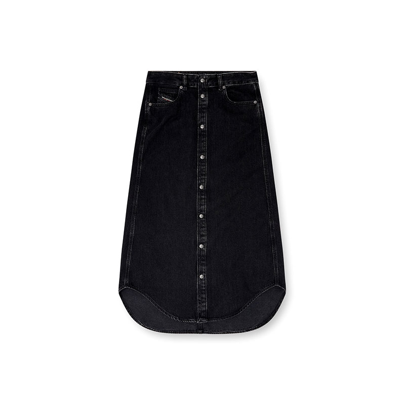 Midi cotton skirt with button closure along the entire length and a five-pocket design. The rounded hem, visible seams, and back patch complete the look with sophisticated details.