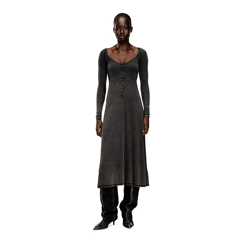 This women’s long-sleeve dress has a décolletage-baring Henley neckline and a slim bodice that flows into a softly draped midi skirt. Cut from ribbed jersey spun from stretch-enhanced ECOVERO viscose, it’s washed down to a marbled, lived-in fade and detailed with an embroidered Oval D on the back.