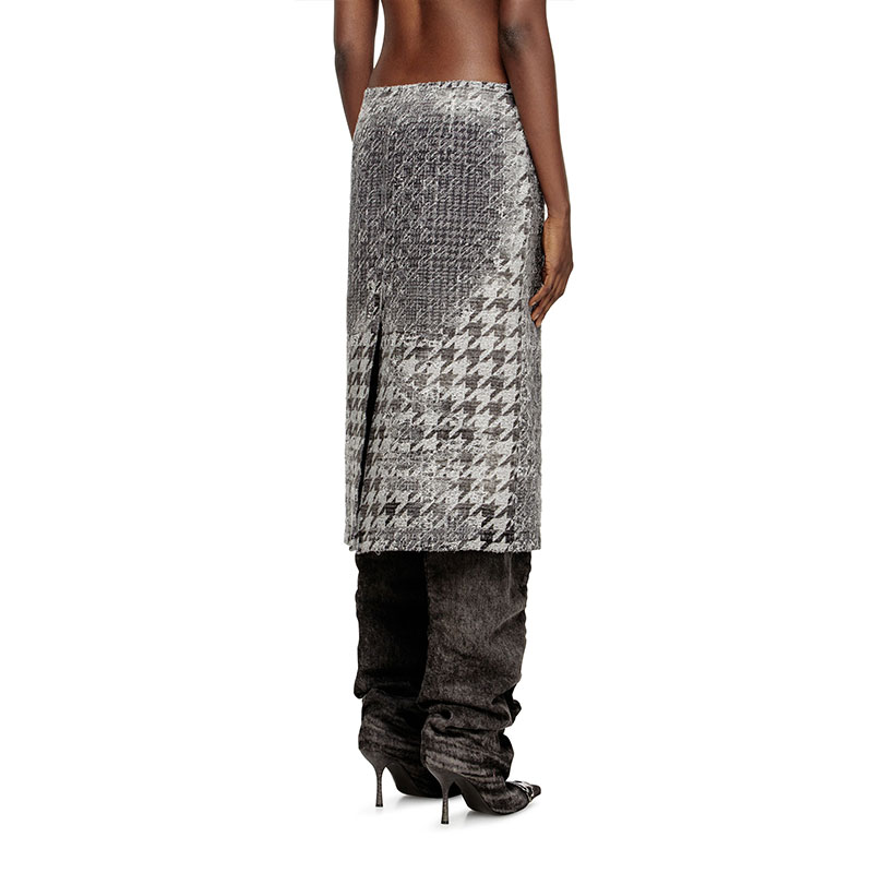 Distressed in Italy, this black fix denim features a distinctive jacquard weave with a double pattern: the houndstooth top layer is burned using a precise laser process to reveal the Prince of Wales motif underneath. Stonewashed with enzymes, this unique worn-in wash is part of the Runway line up, channelling an unconventional haute-couture attitude.