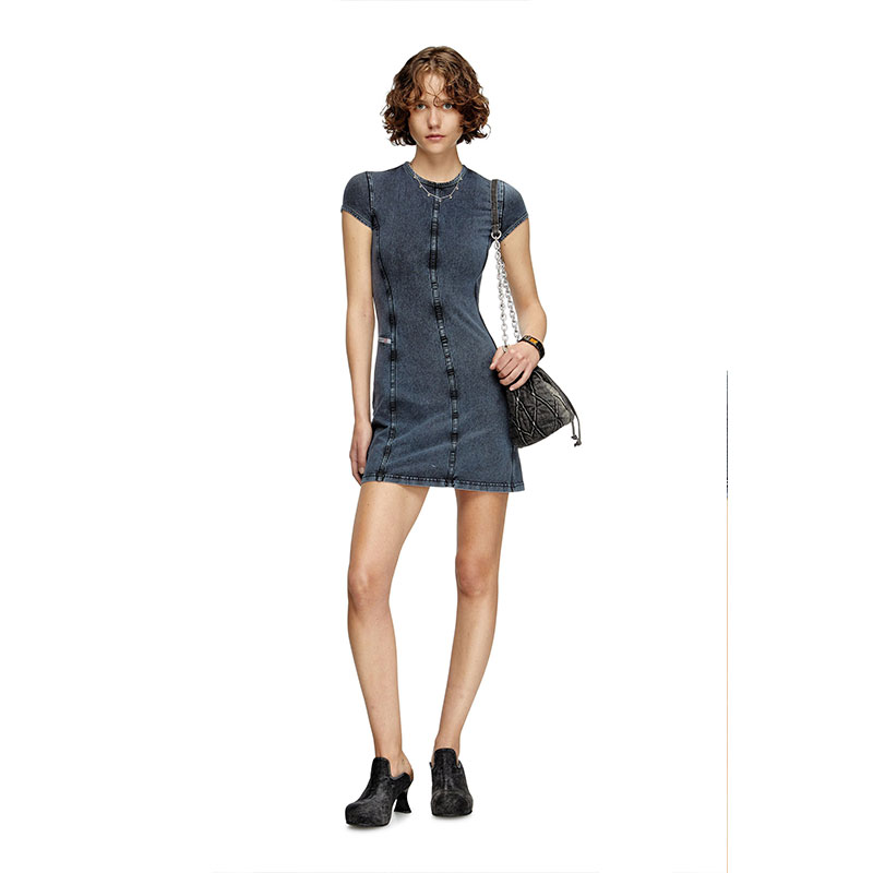 This slim-fit mini dress is made from stretch jersey, but is dyed and washed to look like faded indigo denim. Vertical panelling sculpts the body, detailed with our iconic fifth-pocket flag on the side.