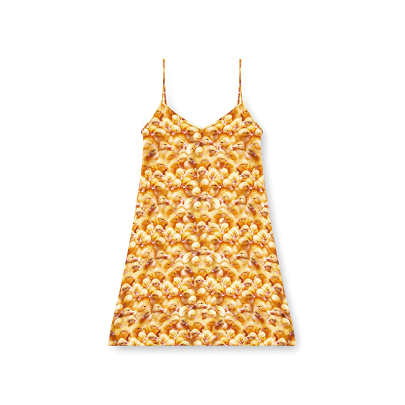Mini dress in viscose with an A-line silhouette, featuring thin straps and a soft neckline. Decorated with an all-over chick print, it has the Oval D metal detail hanging on the back on the right side of the strap.