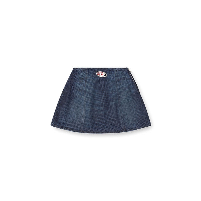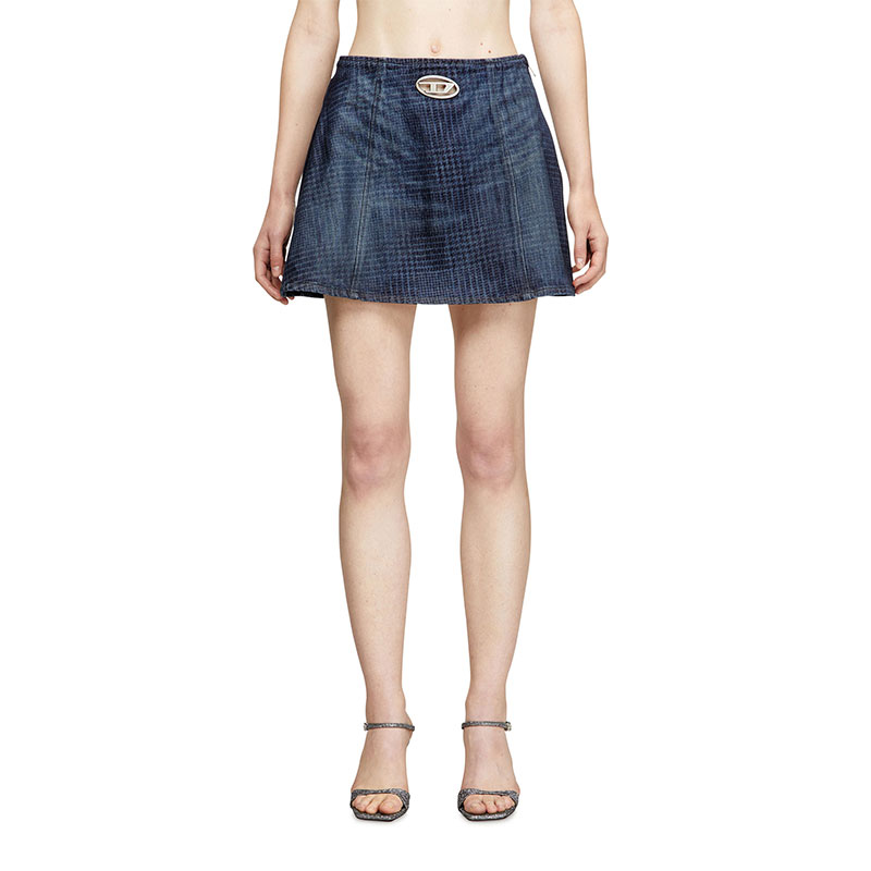 This short skirt is cut to sit at the natural waist and flare slightly at the hips, creating an A-line shape. A metal Oval D plaque is embedded and cut-out at the front, substituting the belt buckle.Crafted from a combination of cotton and hemp, the fix denim nods to traditional tailoring, while keeping true to Diesel's DNA. A subtle Prince of Wales pattern is meticulously traced onto the fabric using multiple laser passes. Iconic whiskering and stonewash effects blend with the checks, while a final spray treatment enhances the deep, dark blue hue.