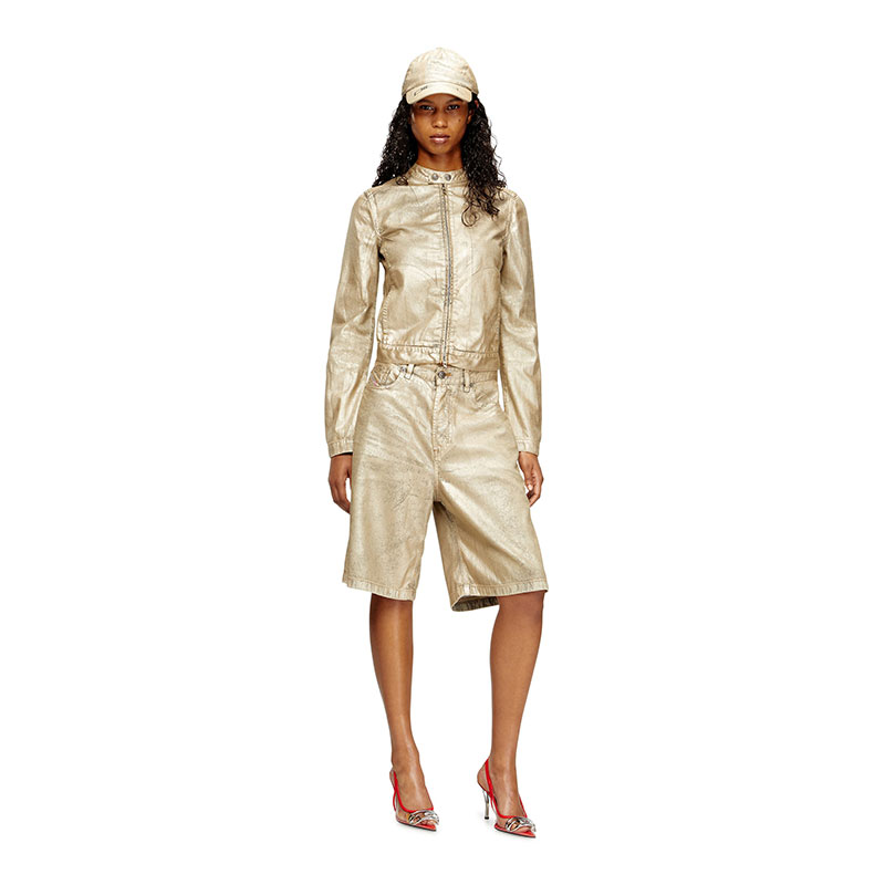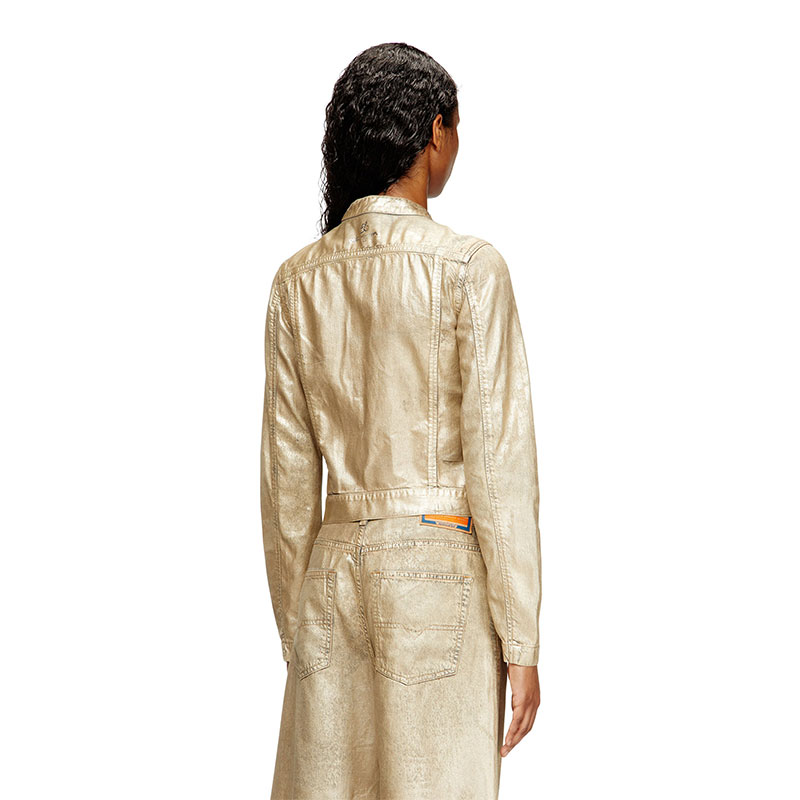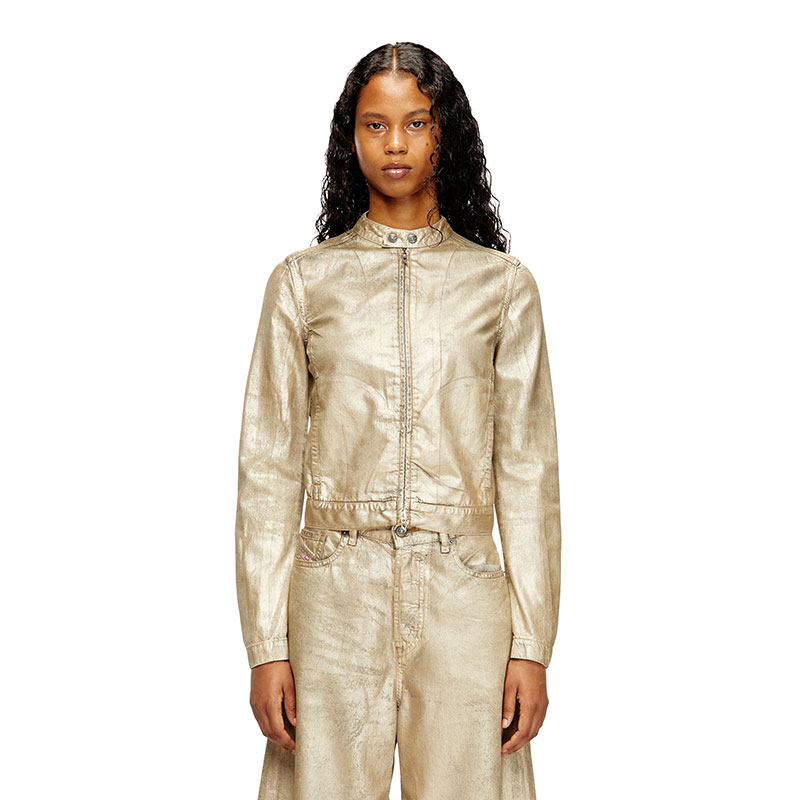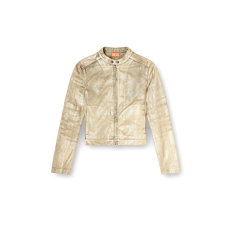 From the Diesel × Karol G capsule — a nine-piece collection echoing the spirit of Tropicoqueta, the Colombian superstar's latest hit album — this women’s biker jacket sets utilitarian denim against high-voltage shine, sparking fearless character. Grey cotton-TENCEL denim is overdyed in sandy tones, coated with shimmery gold Mylar foil, and lasered for a distressed finish. The slightly cropped silhouette inspired by racer styles features a slim snap-fastening collar and two-way zip closure. A silver print on the back completes this exclusive look.