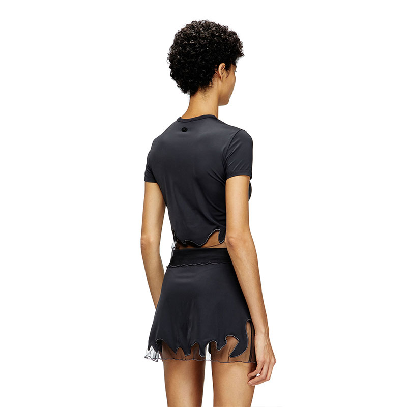 This women's T-shirt features an asymmetric see-through hem that ties in perfectly with the squiggly lines of cord embroidery. Made from black recycled nylon for a stretchy fit that sits close to the body, it's detailed with a metal Oval D on the back.