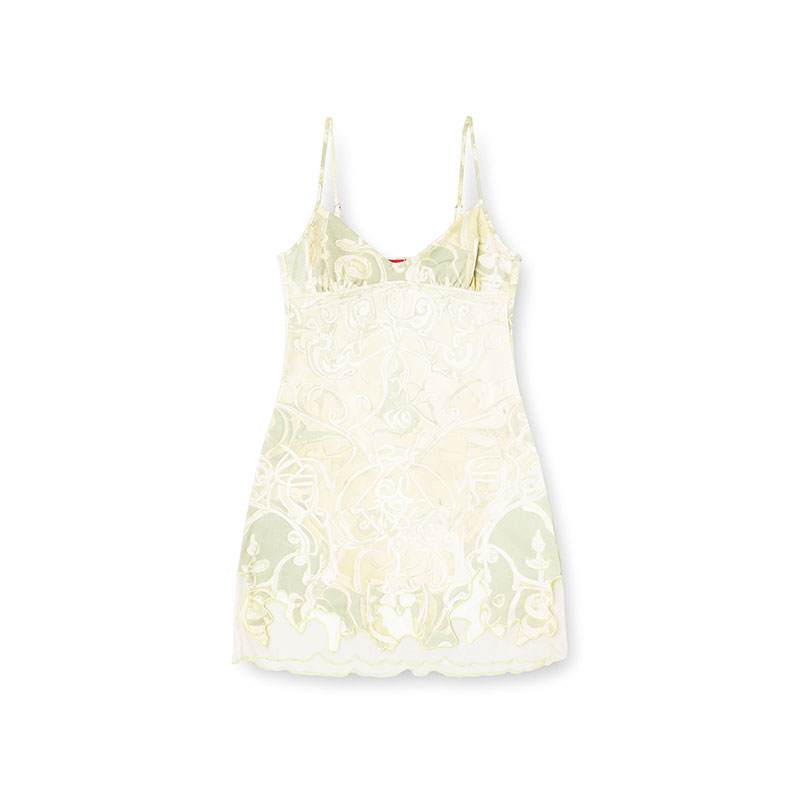 Recycled nylon mini dress, flaunting a wallpaper-style print riffing off medieval artwork. A see-through tulle inlay cuts into its slim silhouette with a doodled line, edged with cord embroidery. Finished with a metal Oval D on the back.