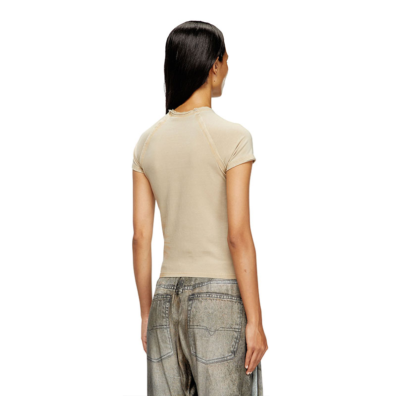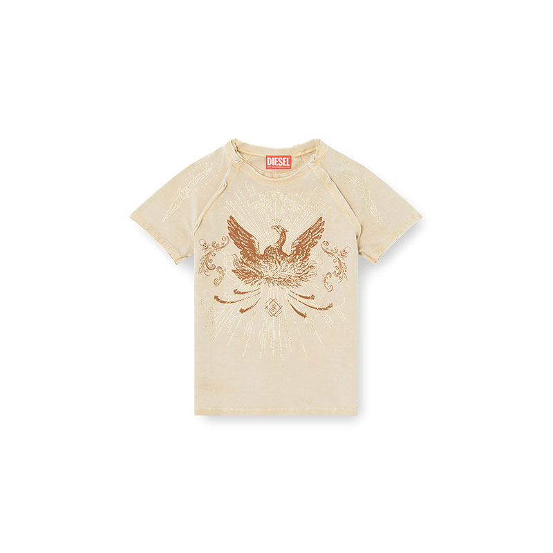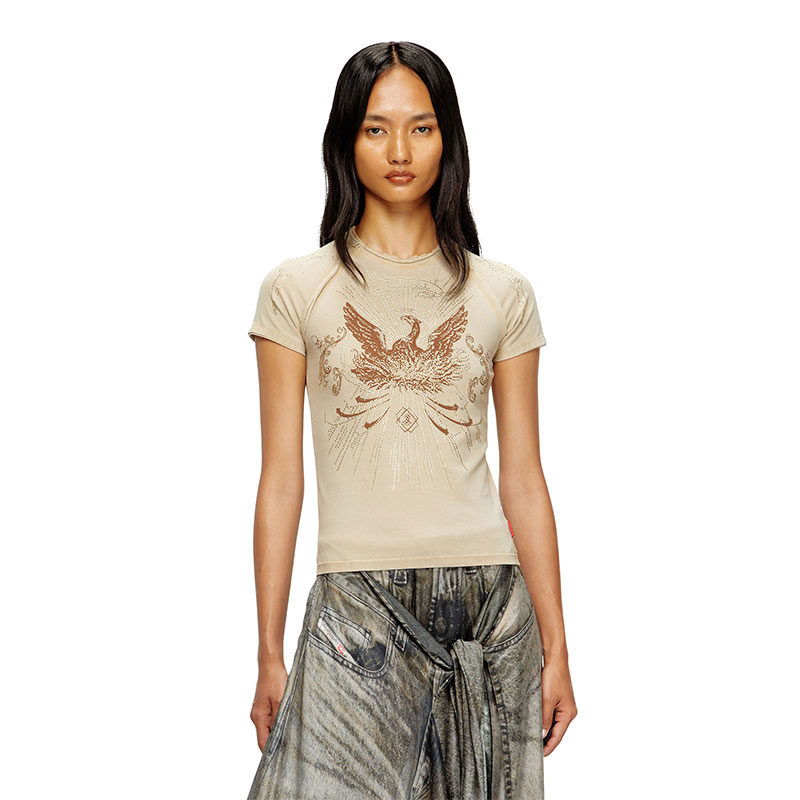 The rugged allure of double raw-cut edges is enriched with glistening sunray rhinestones with this women's raglan-sleeve T-shirt. Built for a slim fit from stretch organic cotton jersey, it's printed with a majestic phoenix and skulls.